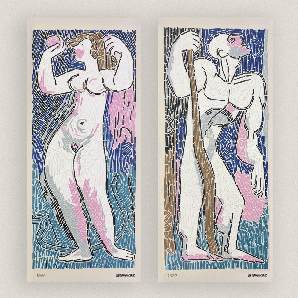 El resultado final es una composición colorista que remite y se inspira en las características formas sargadelianas. Representan los personajes bíblicos de Adán y Eva.