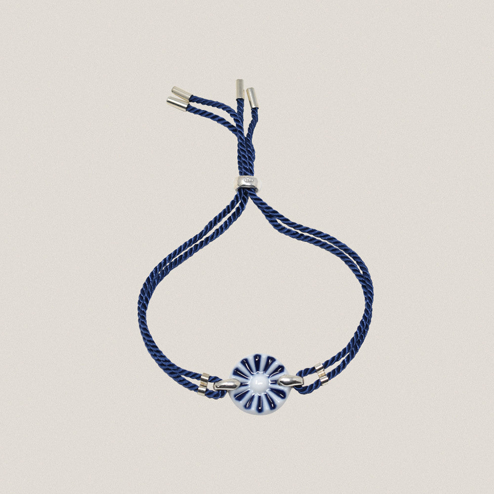 Pulsera de plata de ley y cordón de nylon con placa de porcelana en relieve decorada en azul cobalto bajo cubierta.