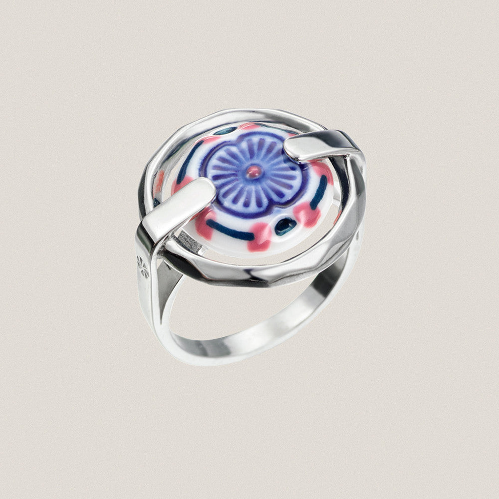 Descripción: Cada una de las piezas de esta colección mantienen los ya altos estándares de calidad de Sargadelos bajo la inspiración del Romanticismo propio de nuestra poetisa más universal, Rosalía de Castro. Sortija en plata de 1ª Ley con placa de porcelana tallada y pintada a mano bajo esmalte.