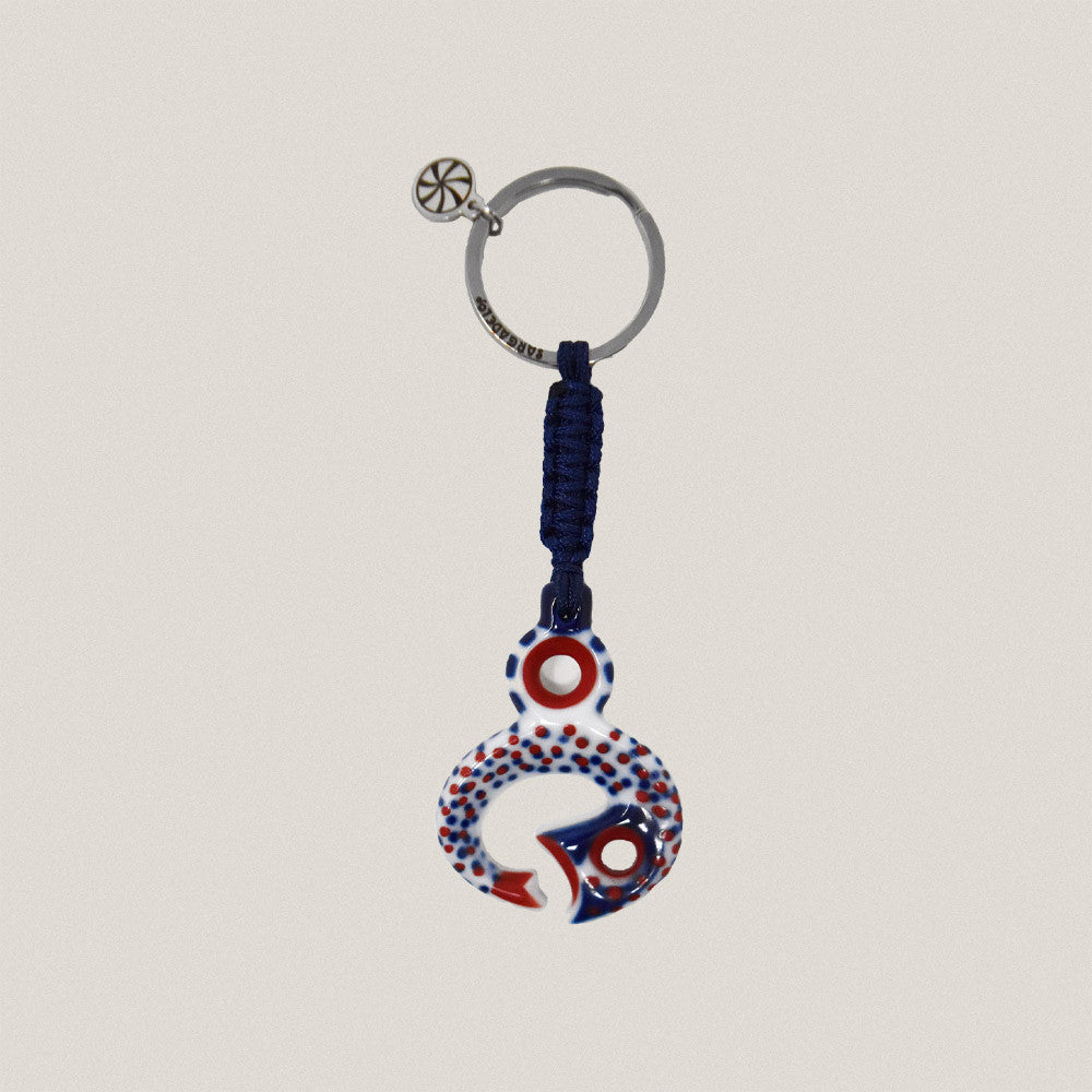 Fetish keychain with ring and trisquel made of steel and nylon thread.