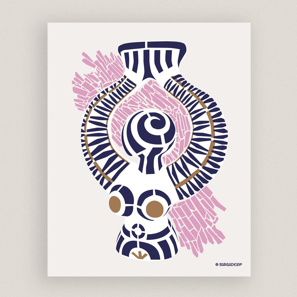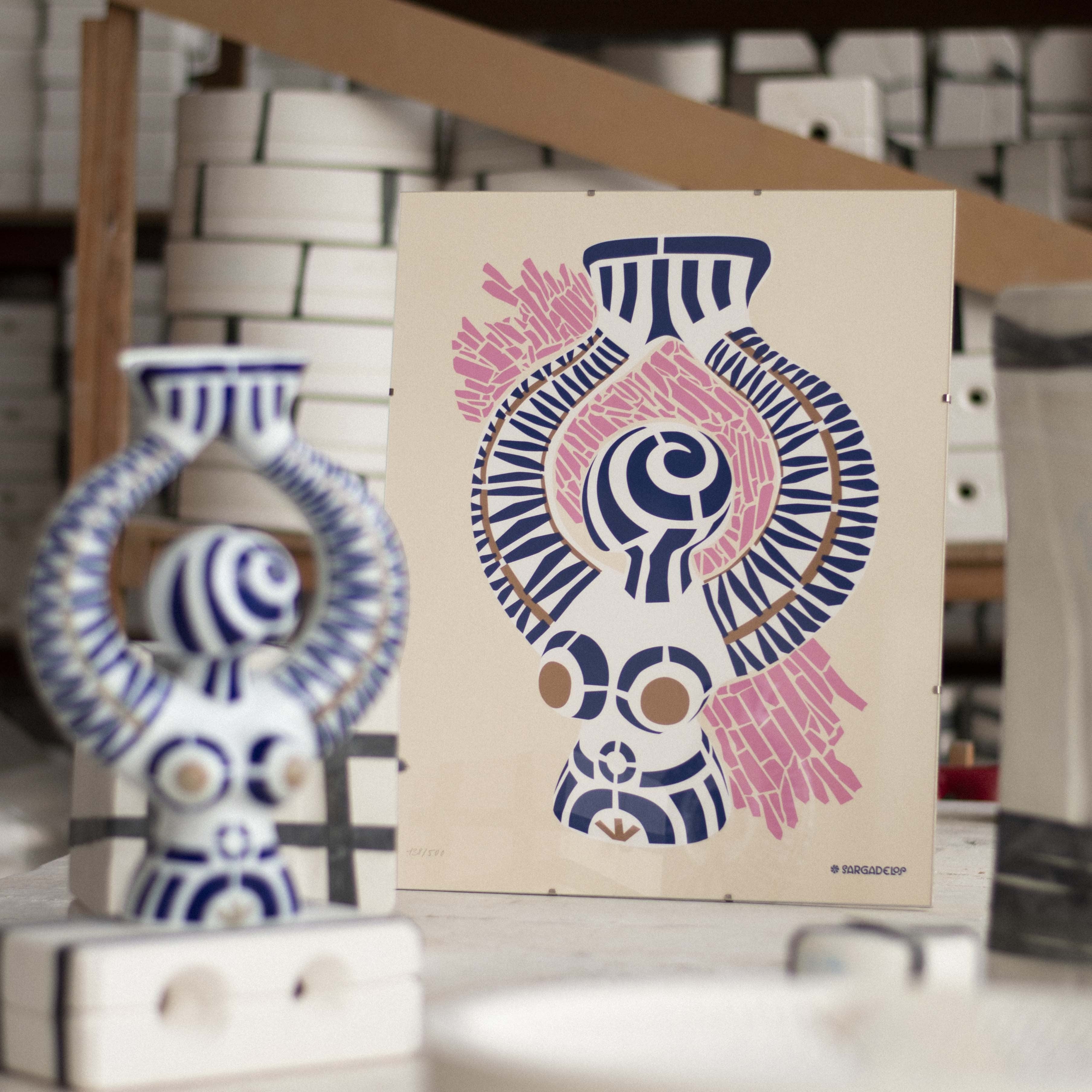 These two new silkscreen prints reproduce two iconic figures from our catalogue in which the Sargadellian language is the absolute protagonist. This is distinguished by the high-contrast geometric decoration (the result of our production method using stencilling) on elementary shapes, developed from the study of traditional Galician pottery figures, specifically those from the Buño region.