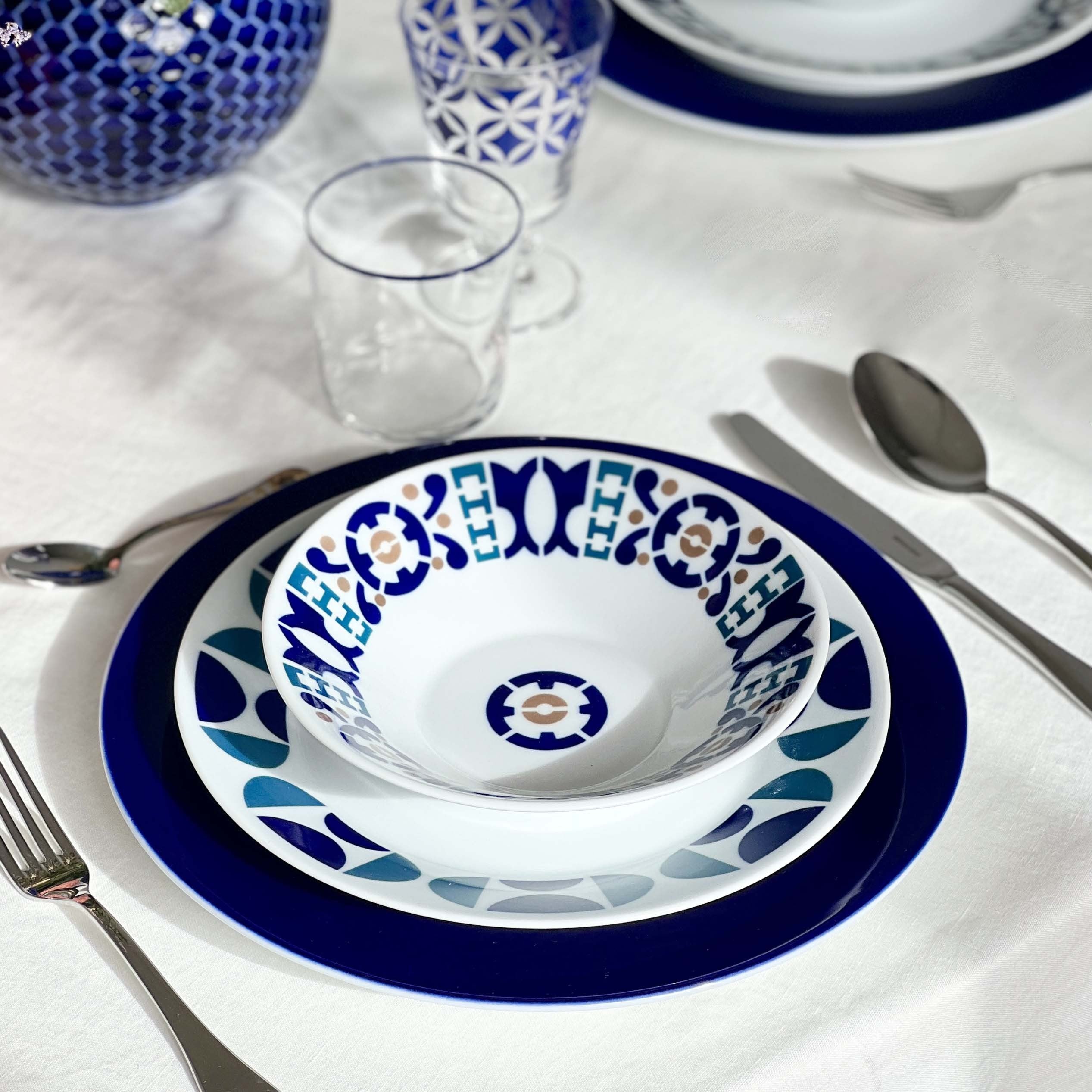 The shape of the glasses and cups present an elegant and minimalist appearance with simple and angular lines, we highlight that the blue edge is hand painted.