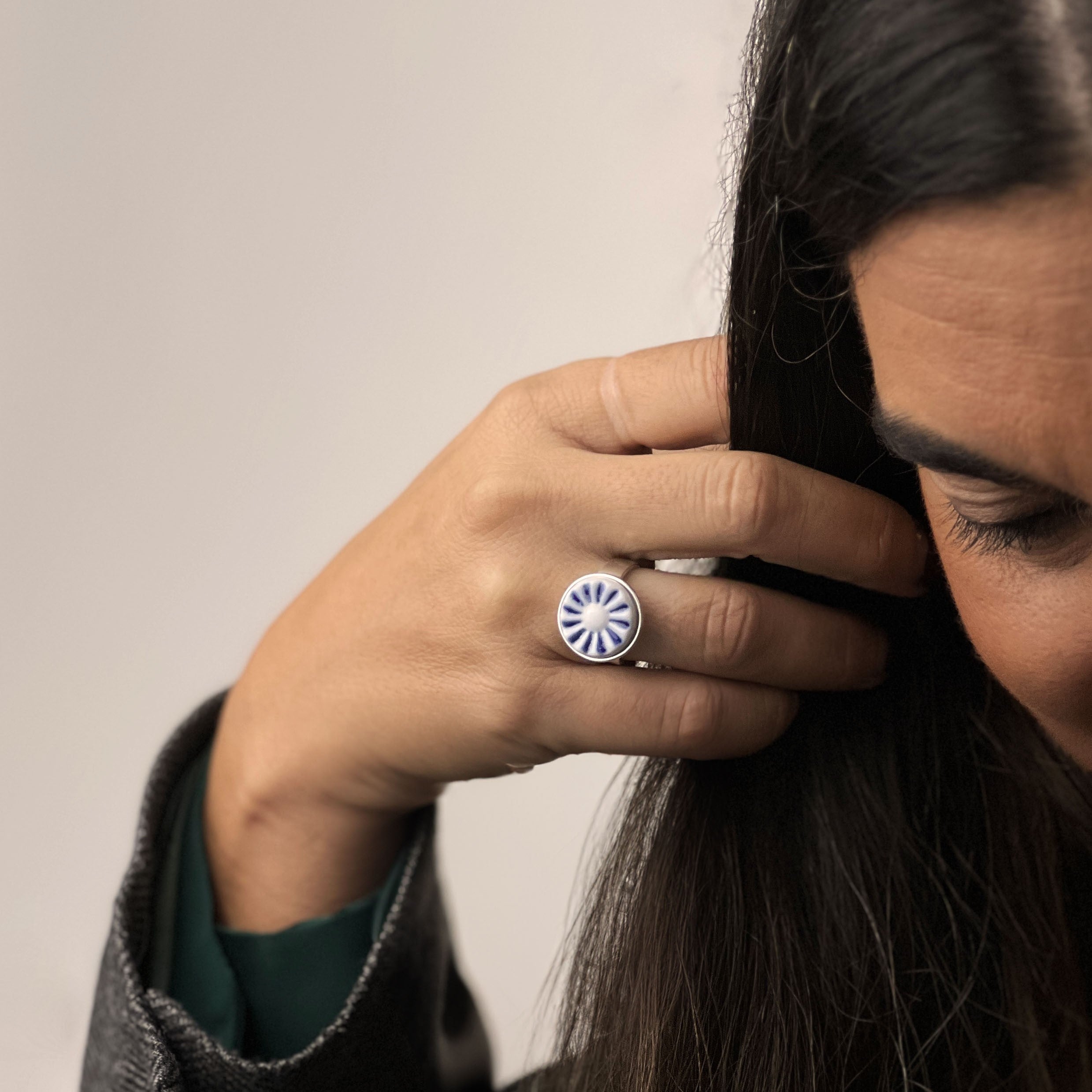 Anillo con placa de porcelana en relieve decorada en azul cobalto bajo cubierta, perteneciente a la colección Estrela.