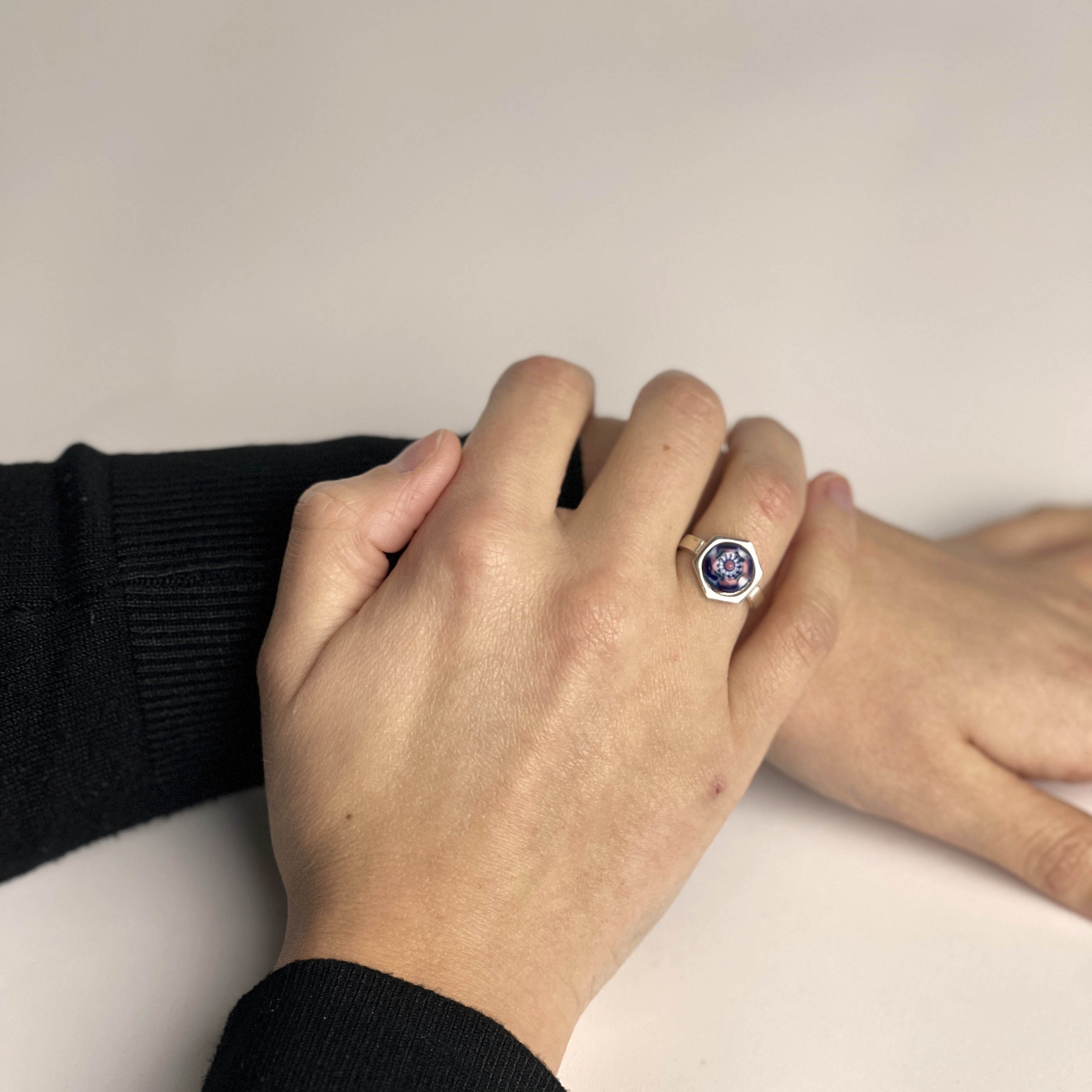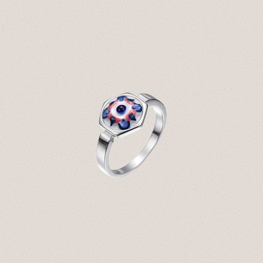 Anillo en plata de 1ª Ley con placa de porcelana hexagonal; tallada y pintada a mano bajo esmalte.