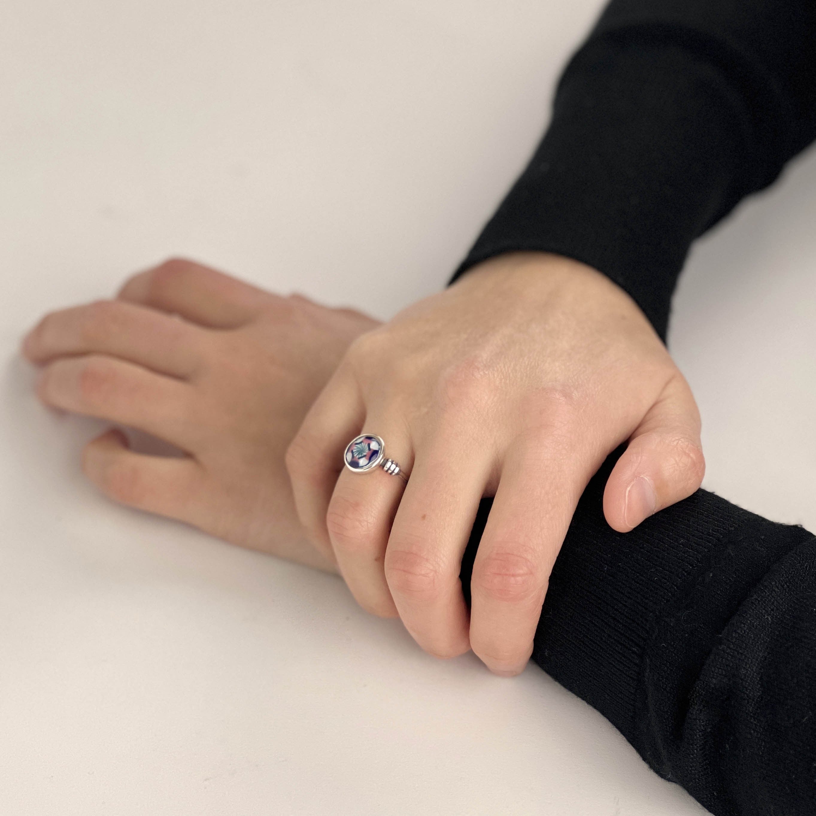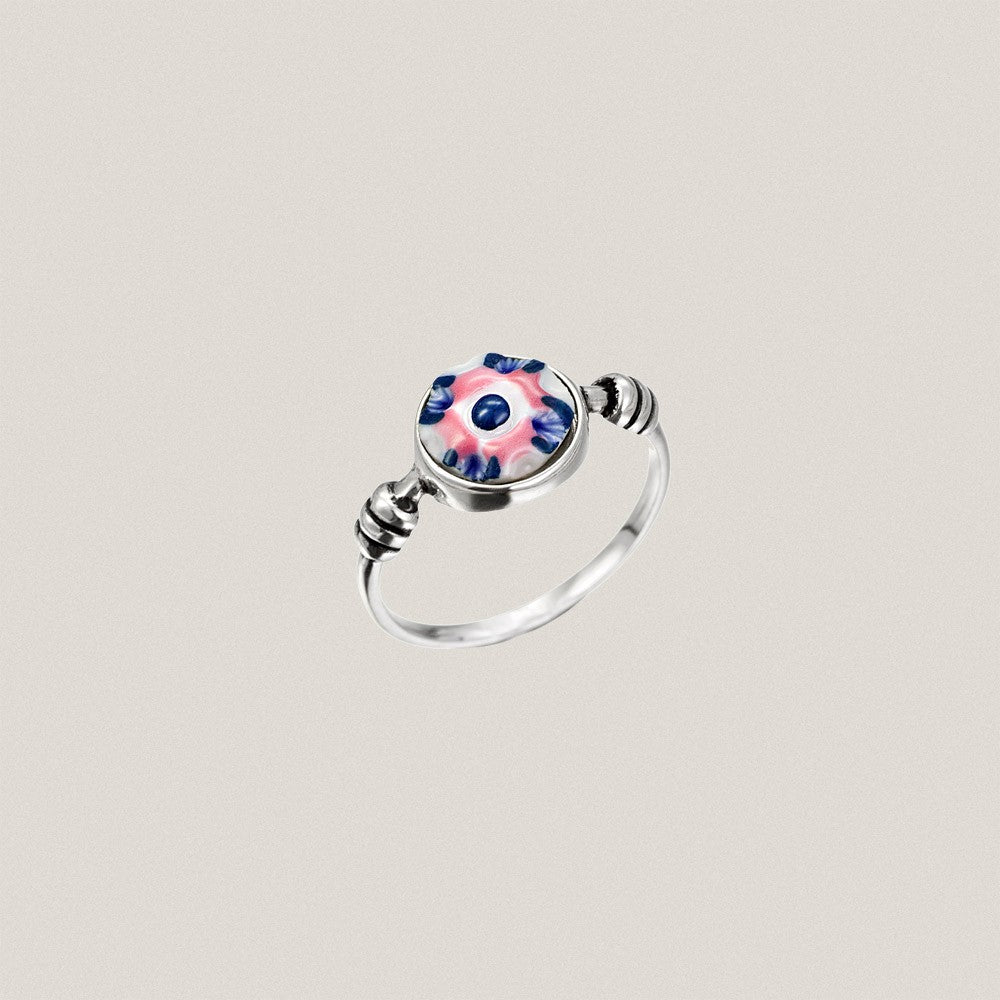 Anillo con placa de porcelana tallada y pintada a mano bajo esmalte. Engarzada en plata con detalles elaborados que evocan a la orfebrería más clásica gallega, remontando sus orígenes a la Edad de Bronce.