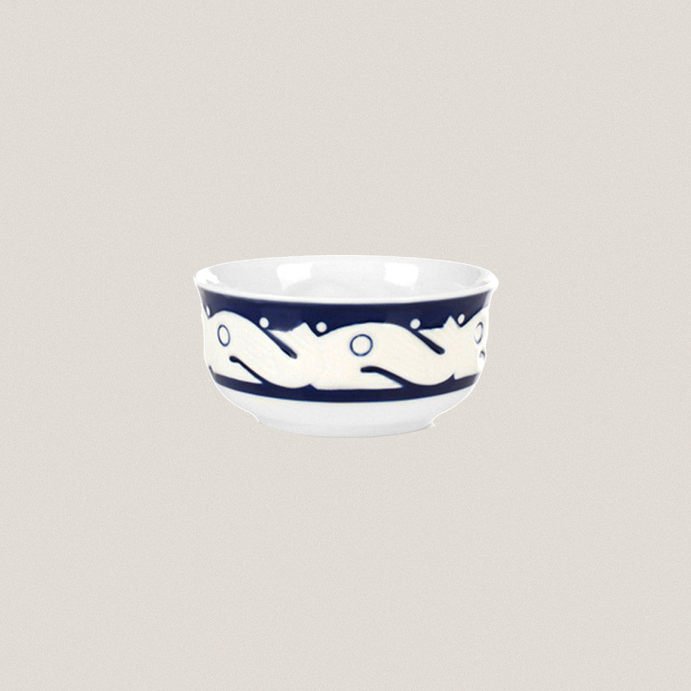 Bol perteneciente al decorado Peixes que se inspira en temas animales modelados en relieve. La versión azul resalta especialmente el motivo representado.