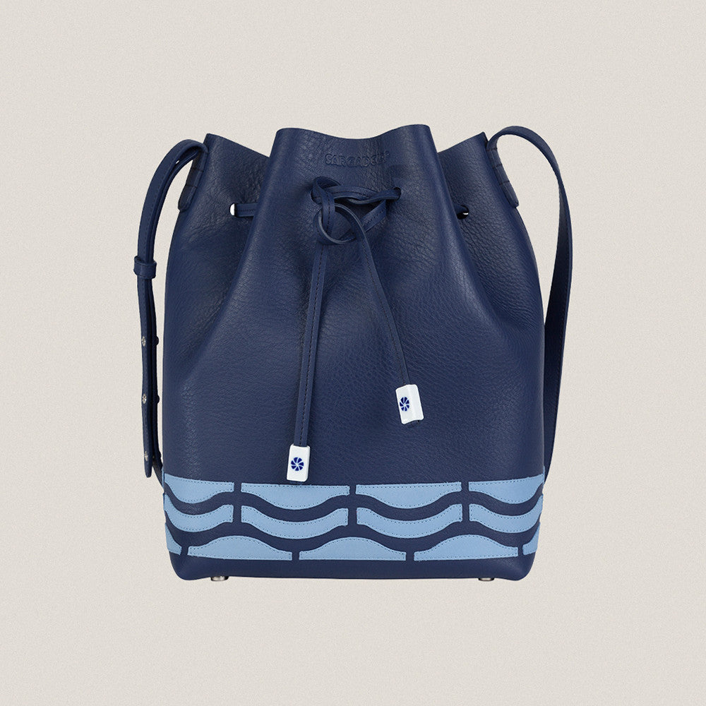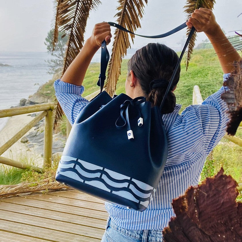 La Bombonera Mar está elaborada en piel de vacuno, tiene un diseño basado en el mar gallego con tejidos cosidos en superposición. Cuenta en su interior con una pequeña pieza de porcelana distintiva de la marca cosida a mano.