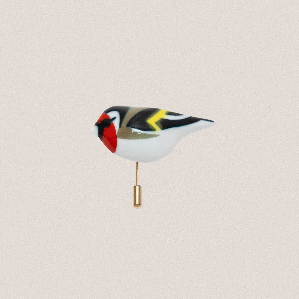 Broche con la tradicional figura decorativa del Jilguero, reinterpretado para lucir como pieza de joyería.