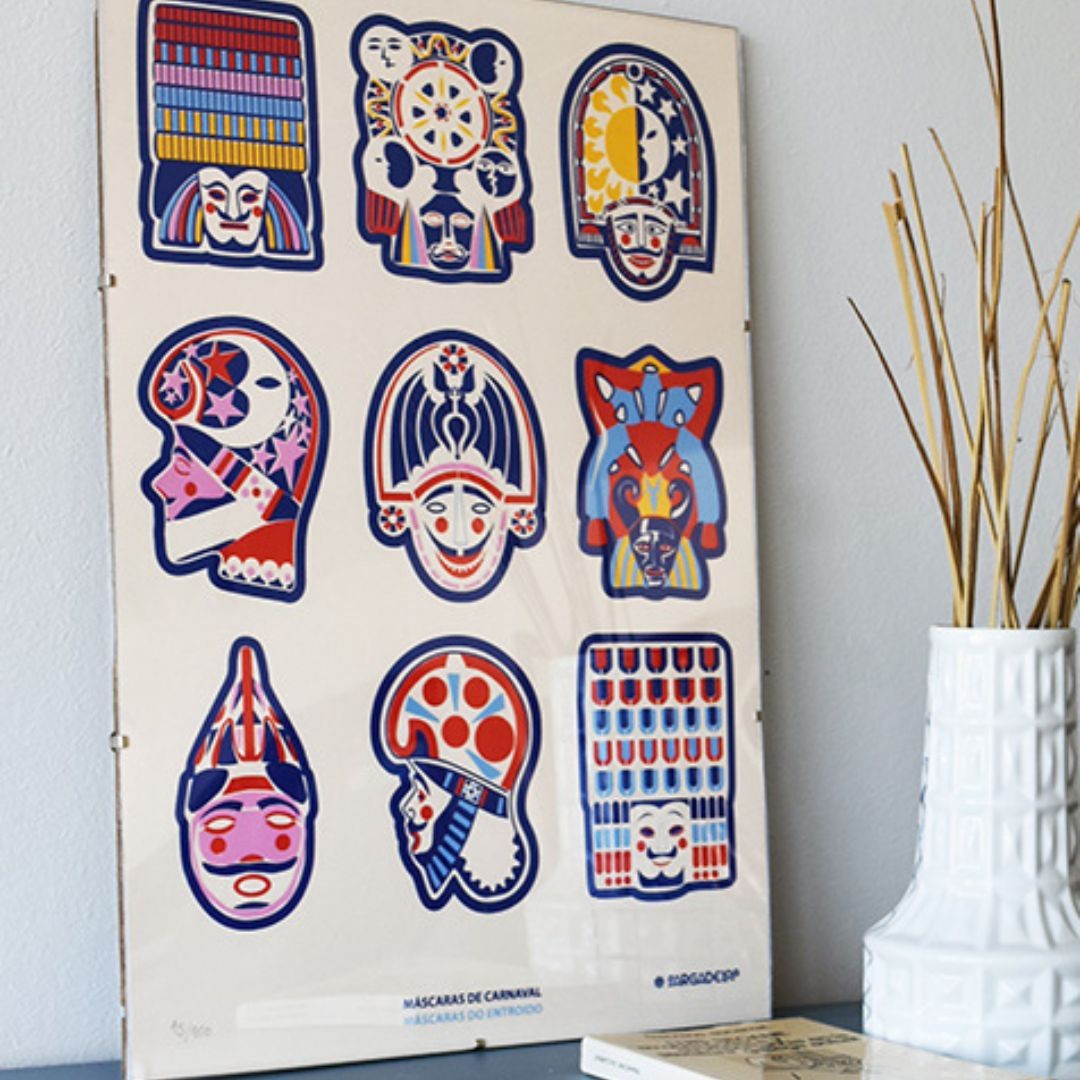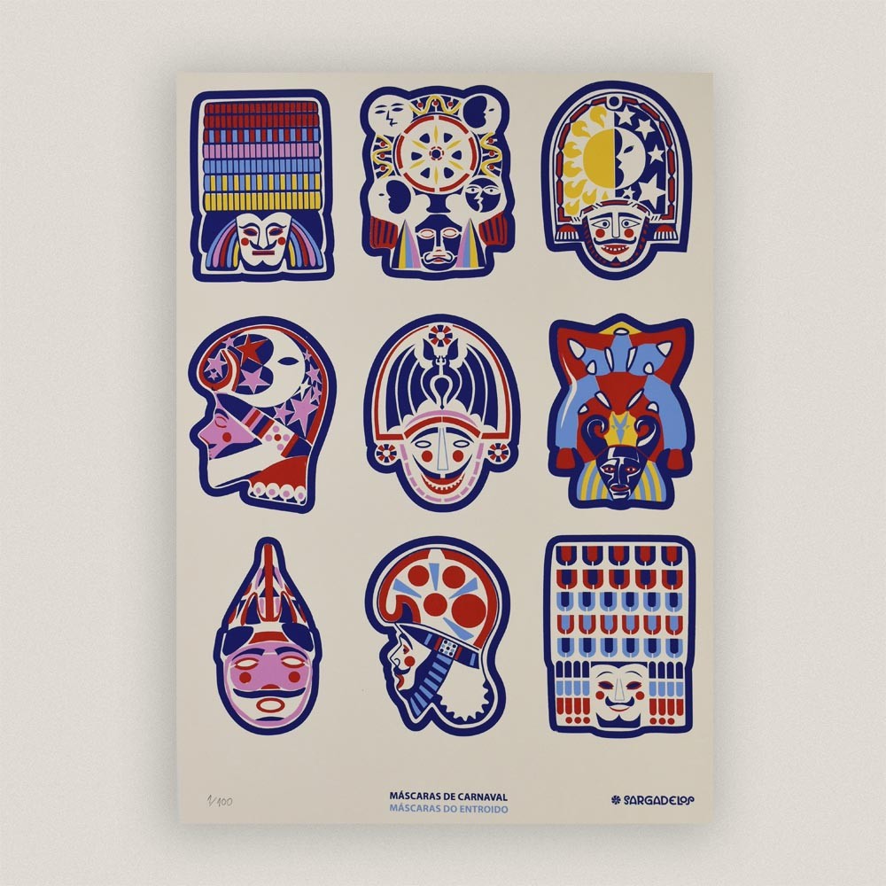 Esta lámina recoge los diseños de SARGADELOS que representan algunas de las variadas máscaras tradicionales utilizadas por los ‘rueiros’ del Carnaval o Entroido gallego.