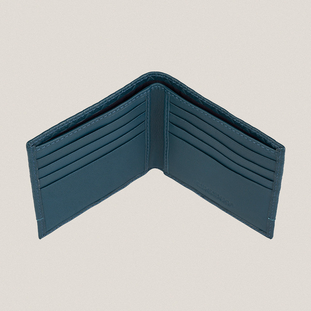 Cartera de piel en color verde perteneciente a la colección Geo. Contiene el símbolo de Sargadelos inscrito sobre la misma piel en cara delantera y nombre Sargadelos grabado en el interior.