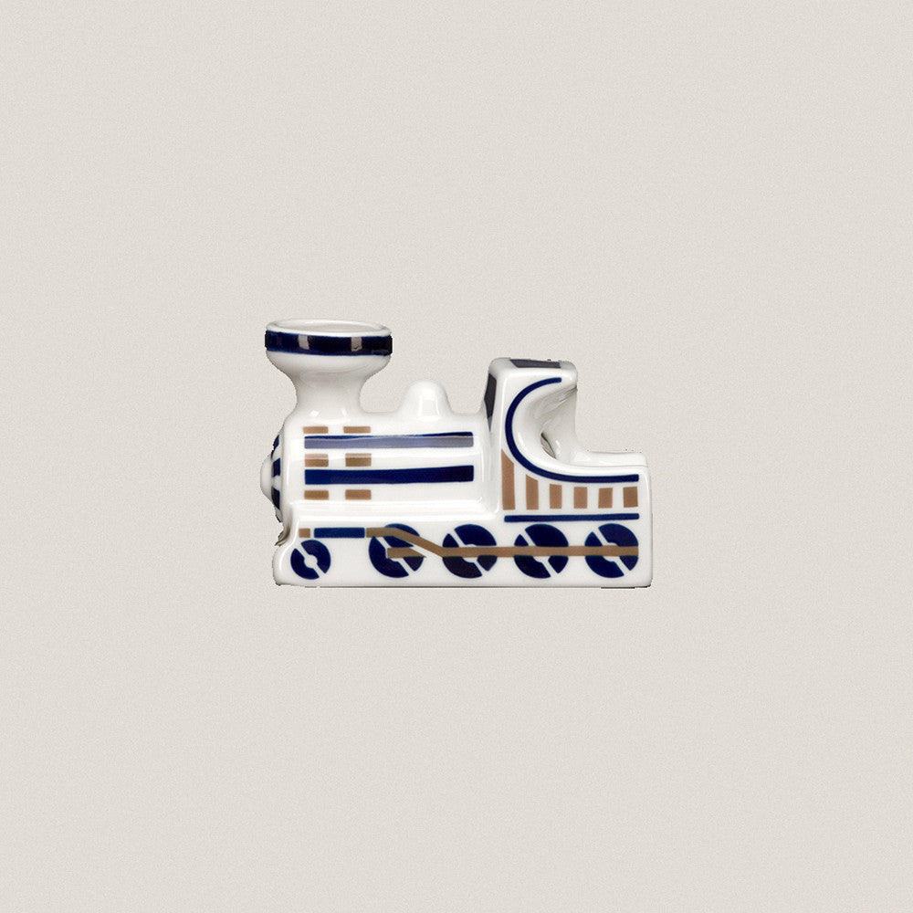 Cenicero en forma de locomotora pintado a mano en azul cobalto y marrón.