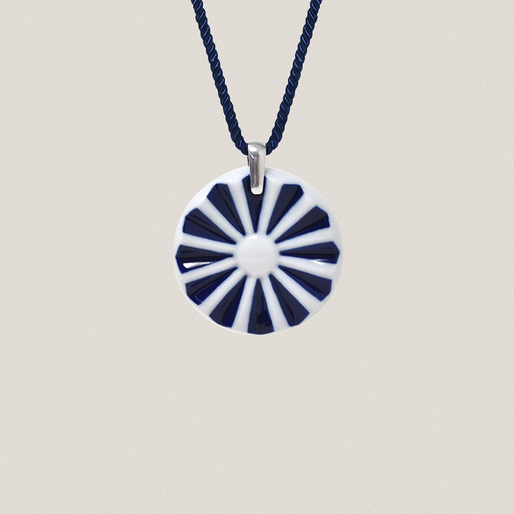 Collar de plata de ley y cordón de nylon con placa de porcelana en relieve decorada en azul cobalto bajo cubierta. La Estrella por su luz es el símbolo esclarecedor de las tinieblas, del espíritu, de la sabiduría y de lo que viene del más allá. Teniendo como referencia la estrella y la vía láctea realizamos esta colección de joyería. Largo ajustable. Cuidados: Plata: Limpiar en agua tibia con detergente lavavajillas y cepillo suave de uñas.