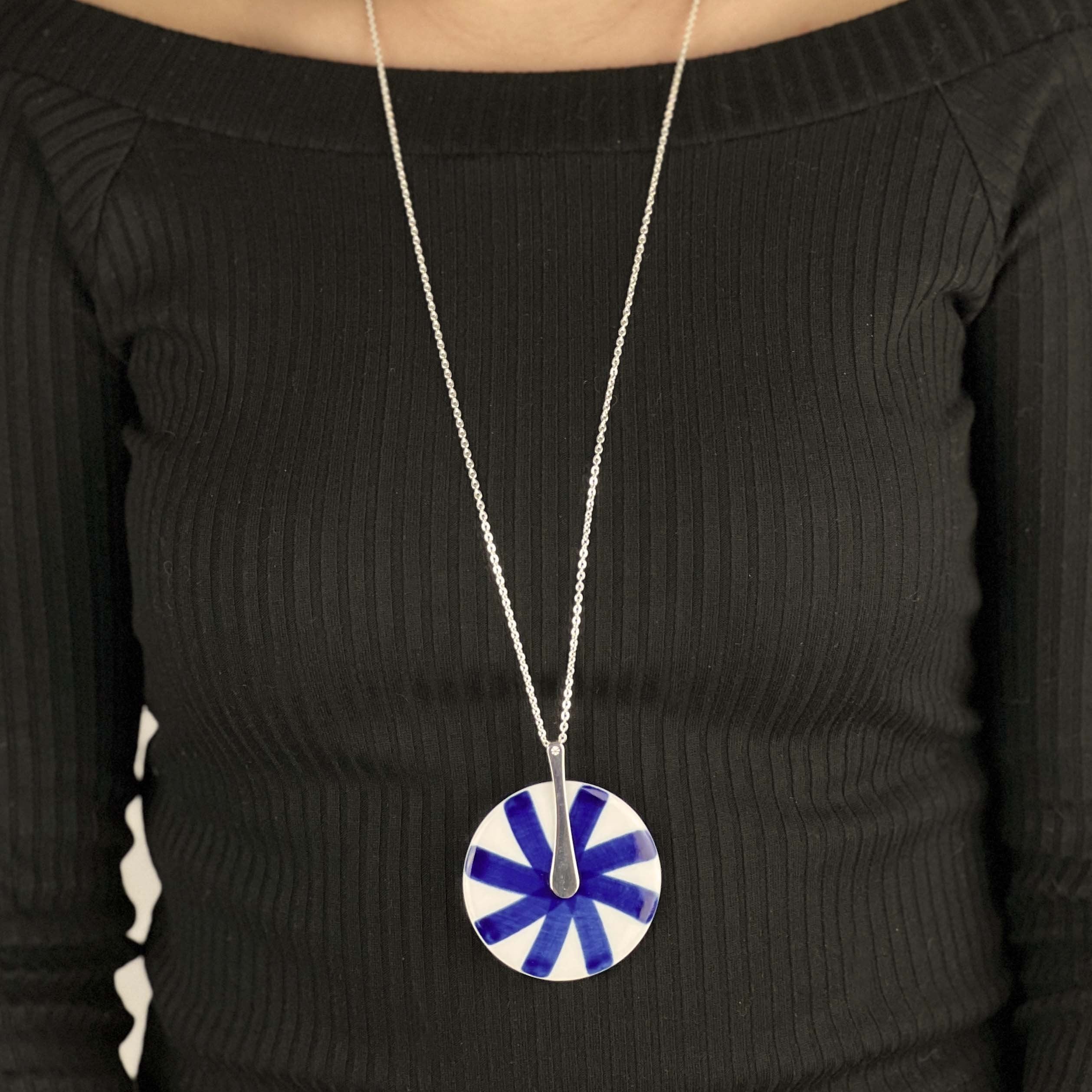Colgante con placa de porcelana pintada a mano bajo esmalte en blanco y azul cobalto.