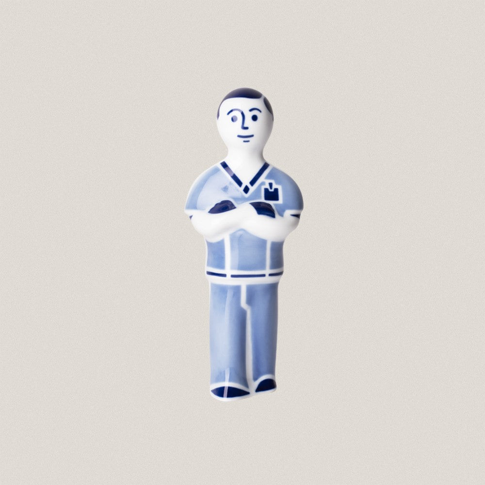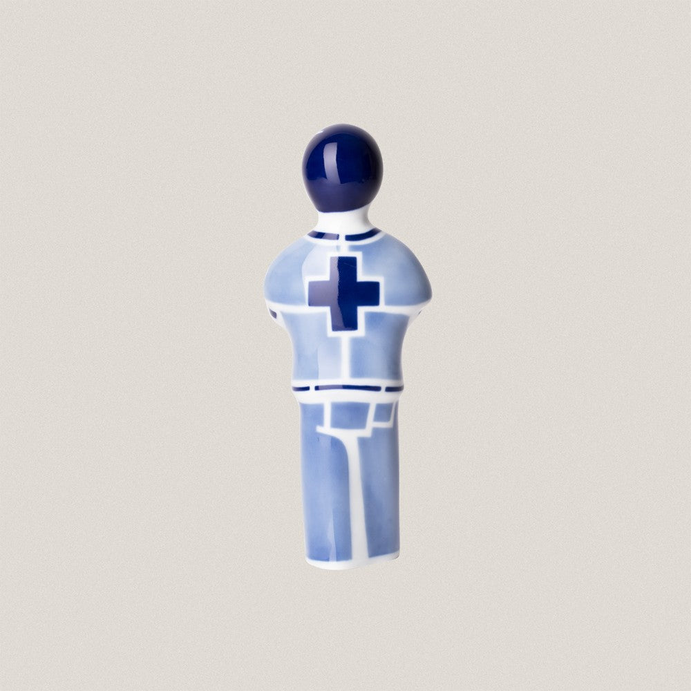 La figura del Enfermero de Sargadelos es un tributo a quienes desempeñan una labor fundamental en el sistema de salud. Esta obra en porcelana, con su característico estilo geométrico, refleja la dedicación, el esfuerzo y la compasión que son el motor de esta vocación. Desde la mirada atenta hasta la postura de cuidado, cada detalle evoca la entrega diaria al bienestar de los demás.