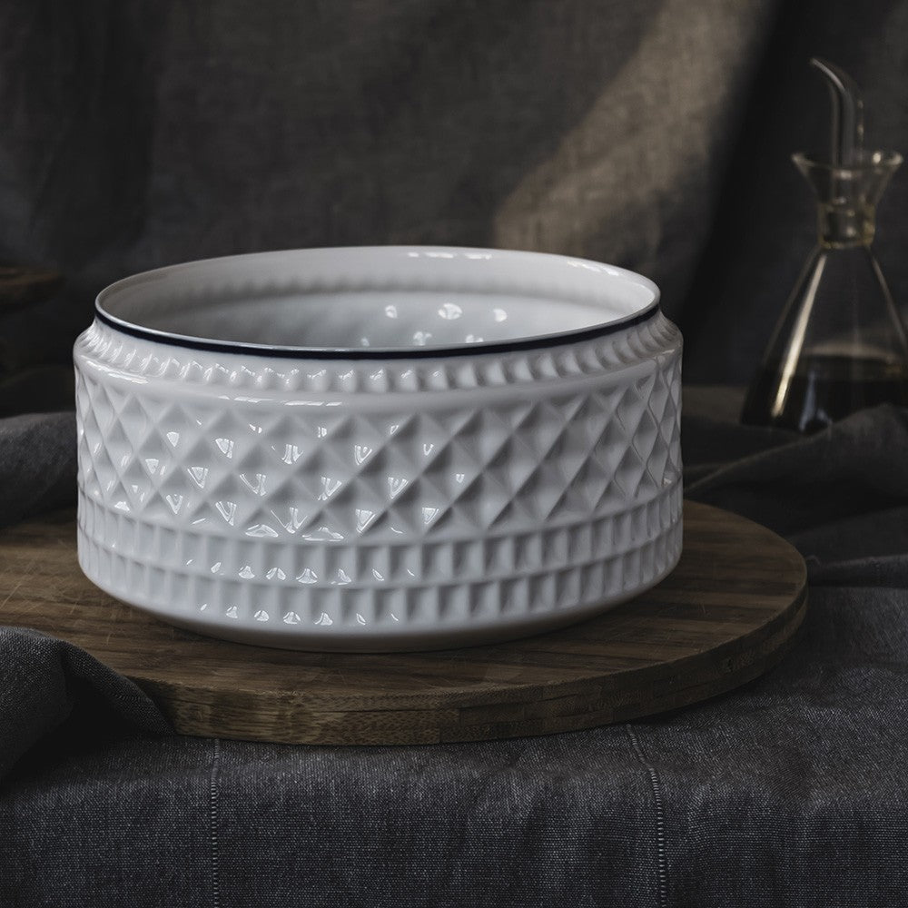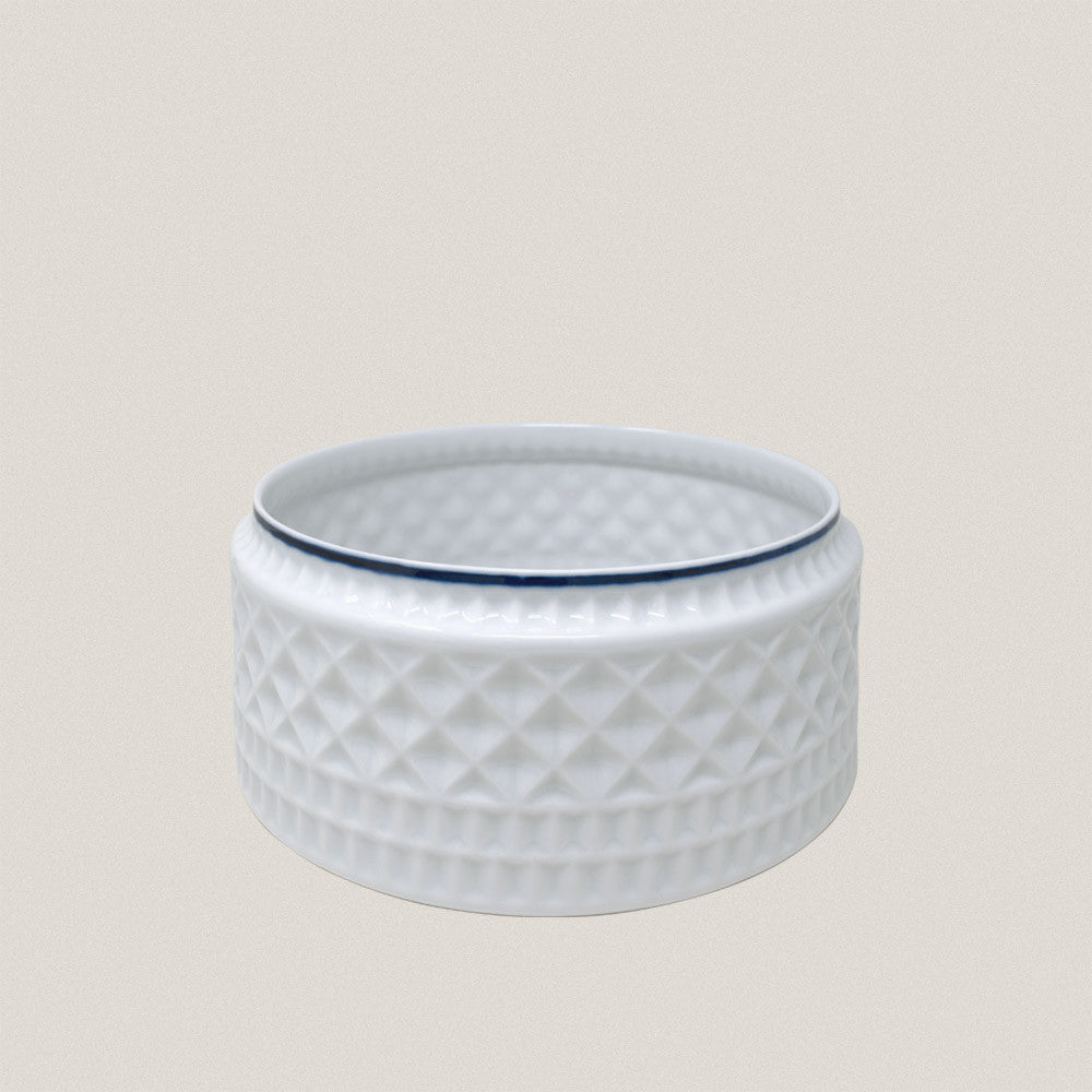 Sus exquisitos motivos en forma de rombos y rectángulos, inspirados en el arte románico gallego, convirtieron a la vajilla Portomarínico de Sargadelos, en una de las más bellas y demandadas de la firma. Une la tradición del arte medieval y la estética contemporánea de motivos geométricos. Portomarínico es una de las icónicas vajillas completamente blancas de Sargadelos. A partir de ahora, también exhibirá un filo azul cobalto, el color emblemático de la firma, en un nuevo modelo innovador y lleno de frescura que presentan como novedad para acompañar a la ya clásica Portomarínico blanca.