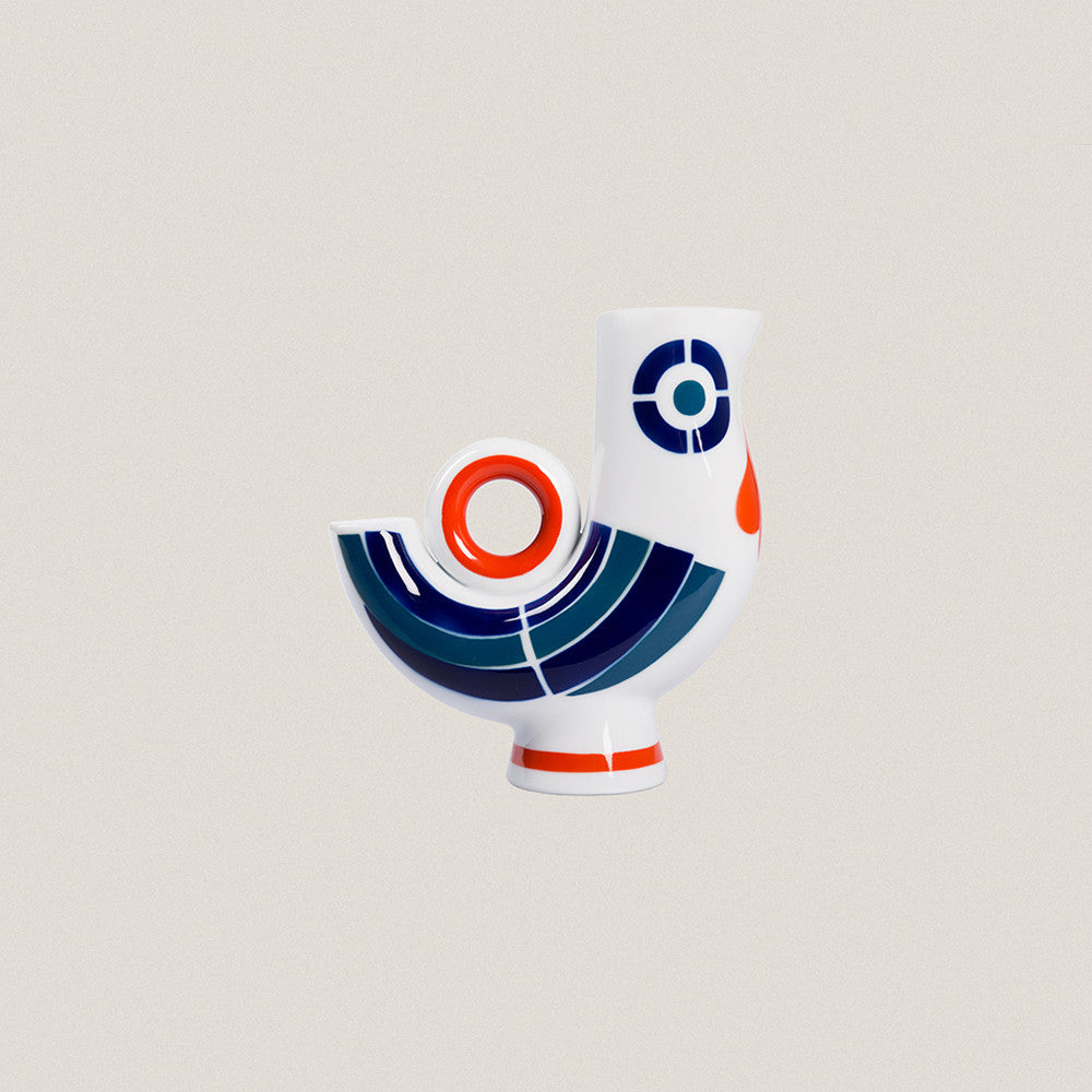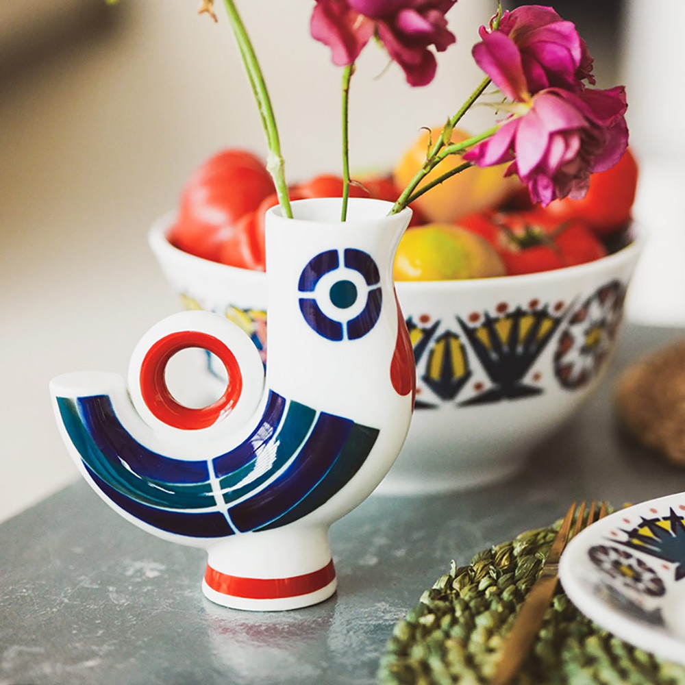Esta pieza decorativa ha sido pintada a mano sobre la porcelana vidriada con color rojo intenso, cociéndose en esta etapa a 800° C (por tercera vez), de ahí que su proceso de producción sea más laborioso.