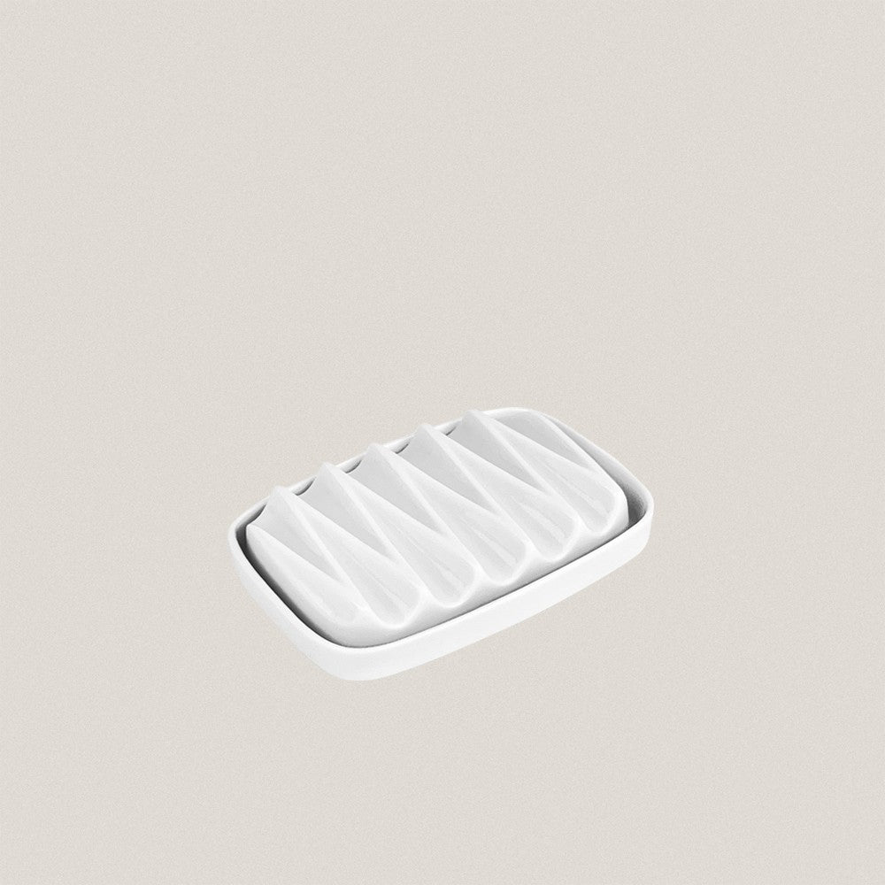 En SARGADELOS nos hemos inspirado en el sinuoso juego de superficies que forman los pliegues de los fuelles para realizar este relieve geométrico, vistoso y simétrico, que aplicamos sobre diversas piezas. En el caso de la jabonera, además, permite el discurrir del agua conservando el jabón seco.