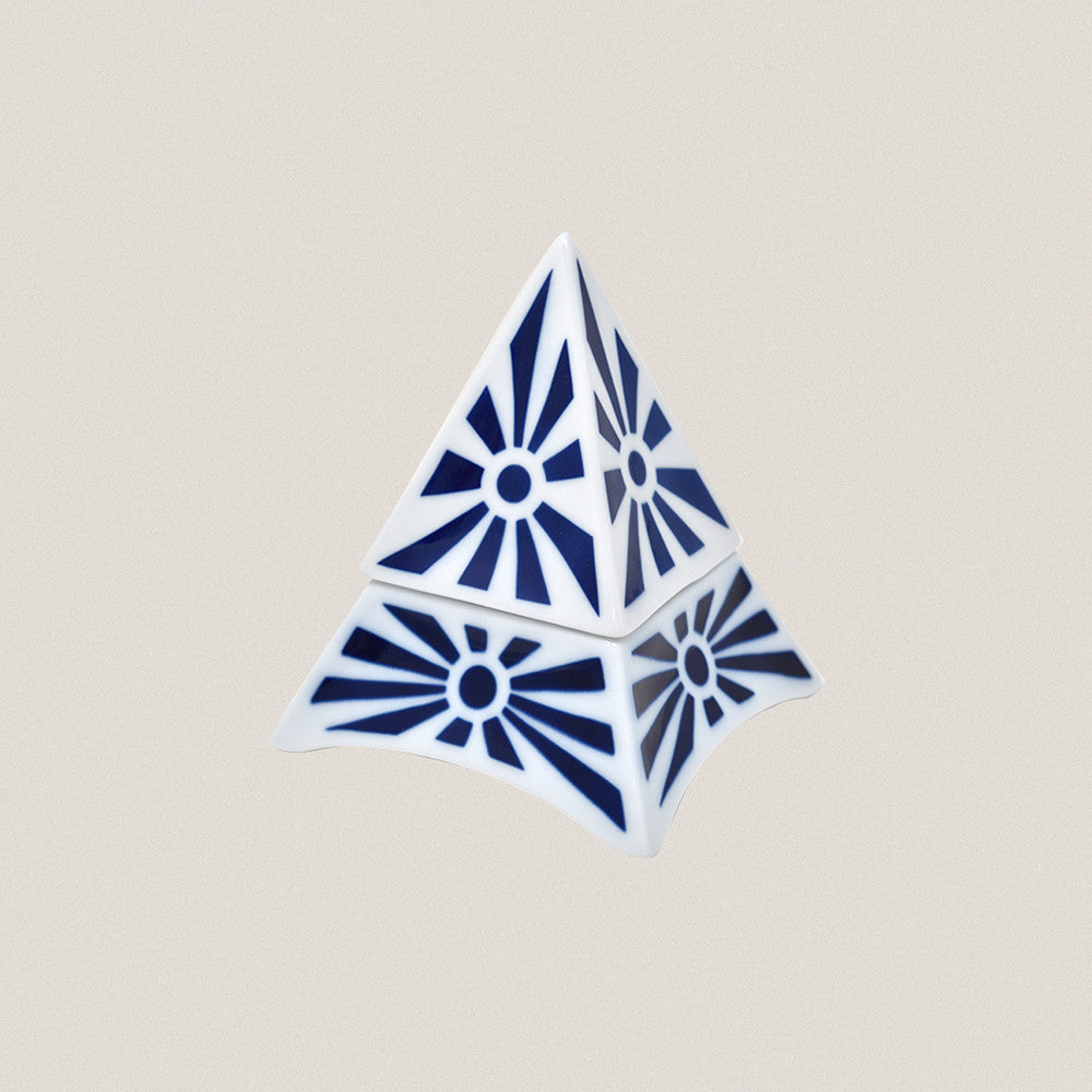 Joyero en forma piramidal pintado con motivos geométricos en azul cobalto.