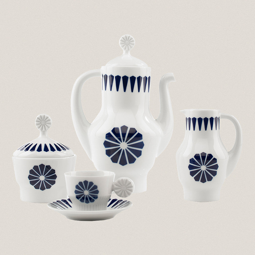 El decorado y forma "Estrela" se diseñó teniendo como referencia las estrellas, la Vía Láctea... y las formas de nuestra alfarería tradicional. Cabe destacar la clara alusión a estos motivos que reflejan las asas y los remates de las tapas en las distintas piezas que forman esta composición.