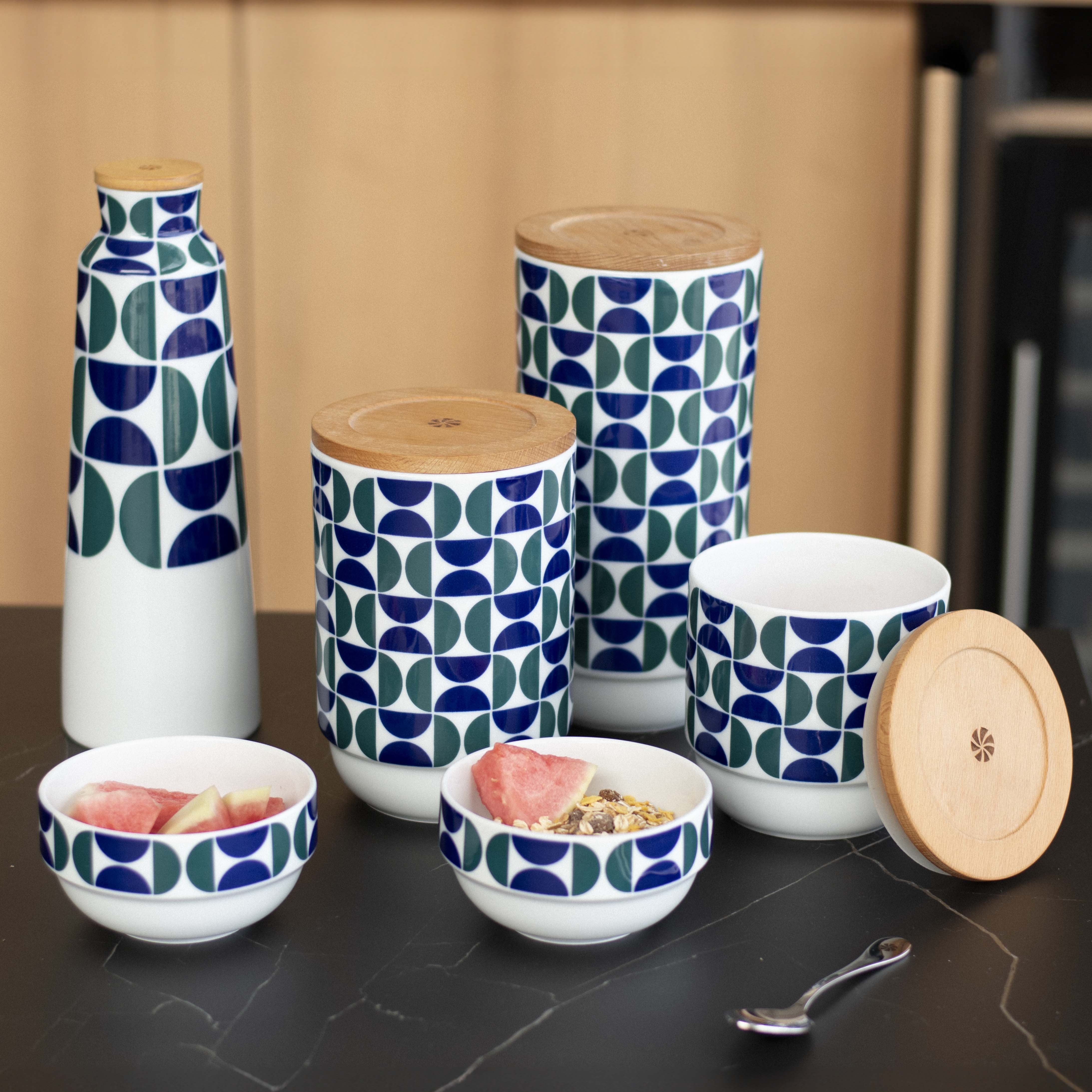 El desayuno en muchos hogares, es la comida más importante del día. No solo por la ingesta en sí, sino también porque esas primeras horas pueden marcar el devenir del día. Desde SARGADELOS queremos que esos primeros momentos sean únicos. Con ese afán presentamos este nuevo pack de desayuno, apilable y con una decoración vibrante y divertida que alegrará las mañanas a sus usuarios. Compuesto por una botella, un tarro grande, ambos con tapa de madera hermética, y dos boles. Este pack le permitirá tener todo a mano y perfectamente identificado. Con la gracia y singularidad de una decoración que juega con los vacíos y las masas de color para comenzar el día con buena energía positiva. Medidas: Diámetro bol y tarro: 12 cm Altura tarro: 25 cm Altura bol: 6.5 cm Alto botella: 28.5 cm Diámetro máximo botella: 10 cm Diámetro boca botella: 5 cm Capacidad Tarro: 2 L Capacidad Bol: 350 ml Capacidad Botella: 1.2 L Material: Porcelana. Cuidados: Apto para lavavajillas y microondas.