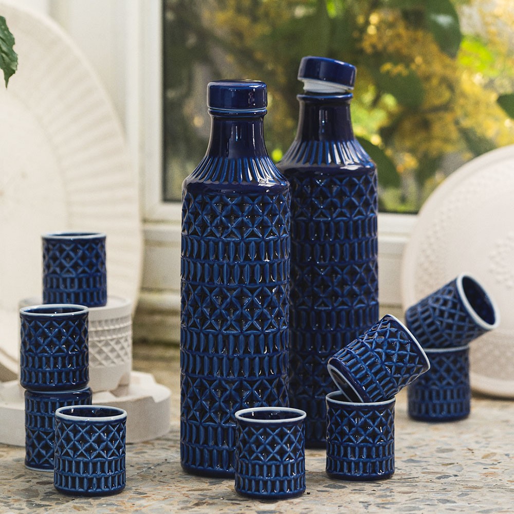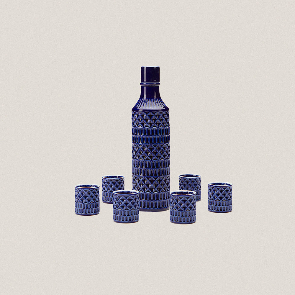 El relieve Portomarínico se inspira en las ménsulas del templo de San Juan de Portomarín, ubicado justo donde el Camino Francés a Santiago de Compostela atraviesa el río Miño. Composición y medidas: 1 Botella con tapa (80x285mm ; 800 ml). 6 Chupitos (50x55mm ; 50 ml). Material: Porcelana. Cuidados: Apto para lavavajillas y microondas.