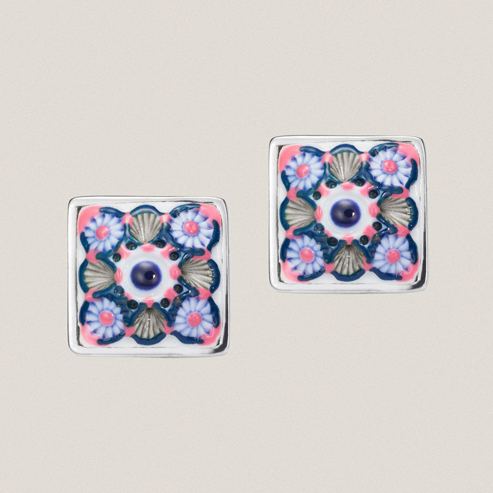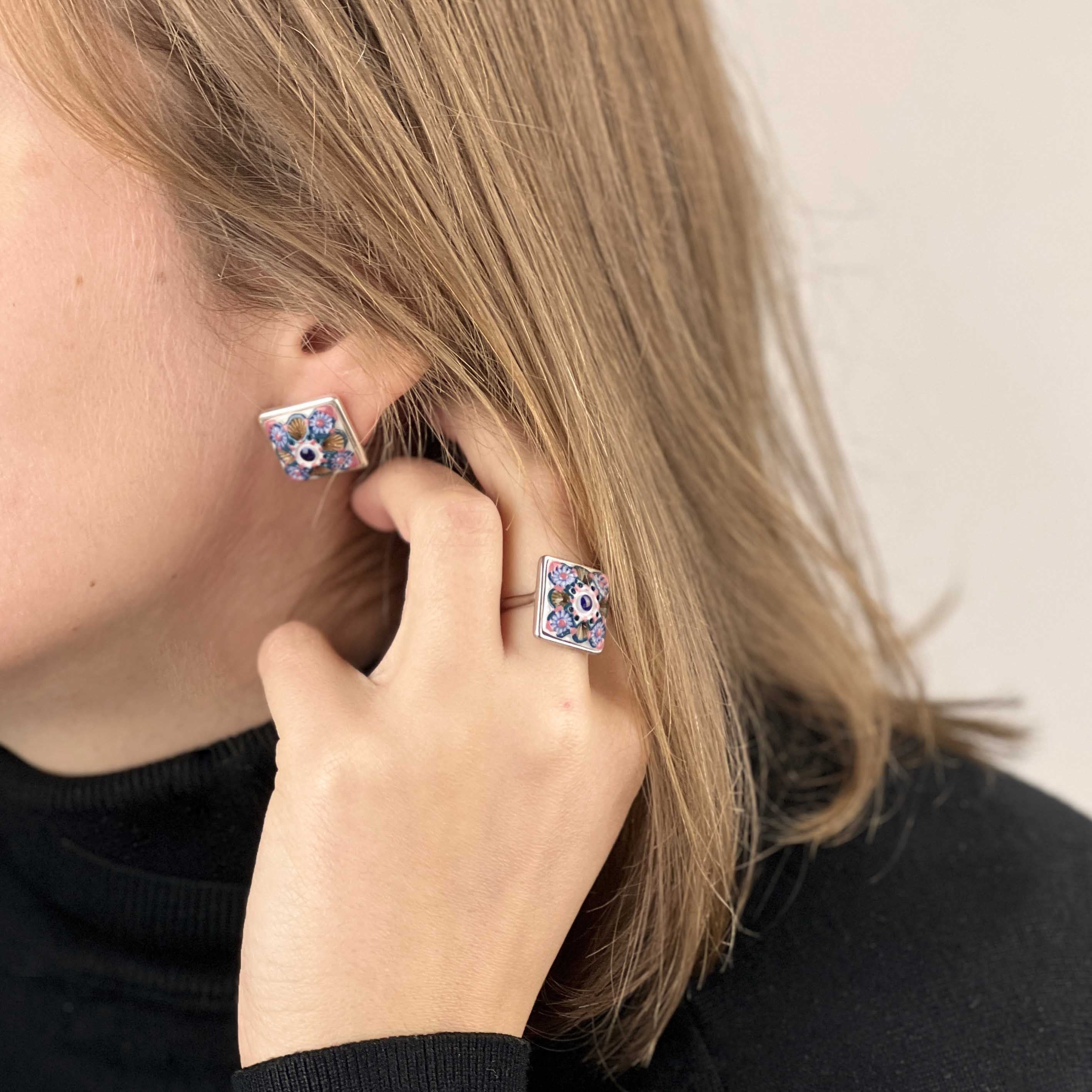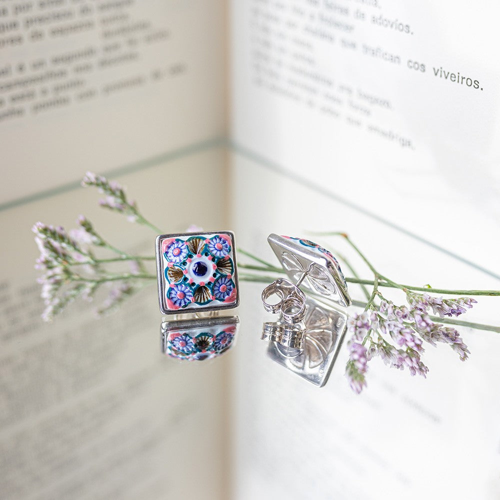Pendientes de plata de 1ª Ley 925 y baño de rodio con placa engastada de porcelana tallada y pintada a mano bajo esmalte.