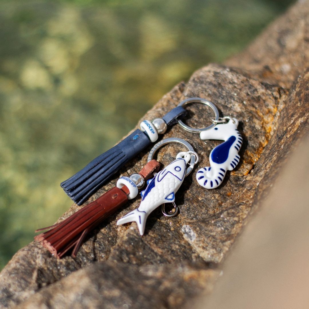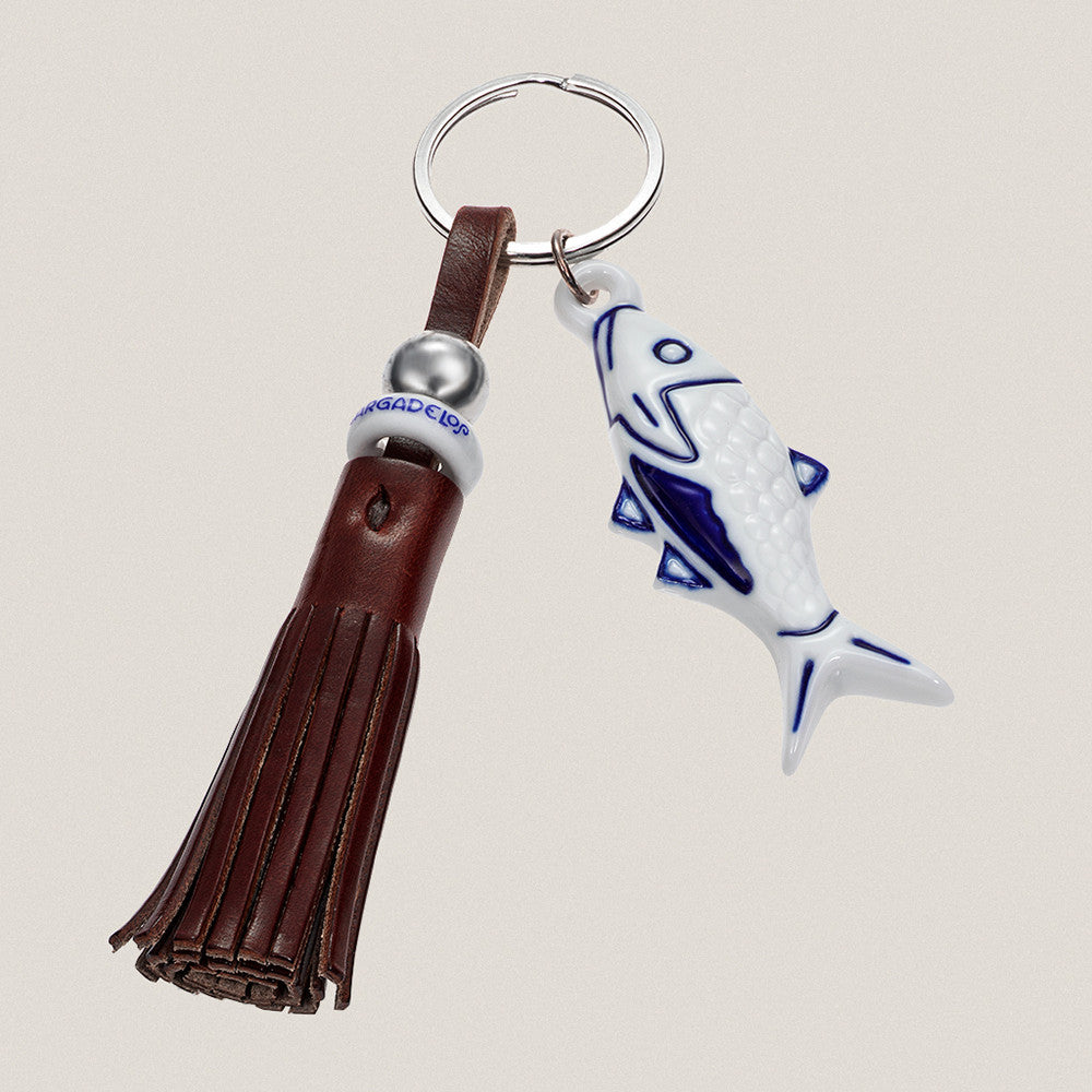 Llavero Sardina de porcelana pintado a mano en blanco y azul cobalto