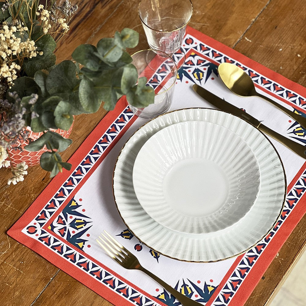 Pack de 4 manteles individuales de 35 x 50 cm pertenecientes al decorado Toxo Color que está inspirado a partir de las geometrizaciones florales que el pintor paisajista Bello Piñeiro realizó en el Casino ferrolano.
