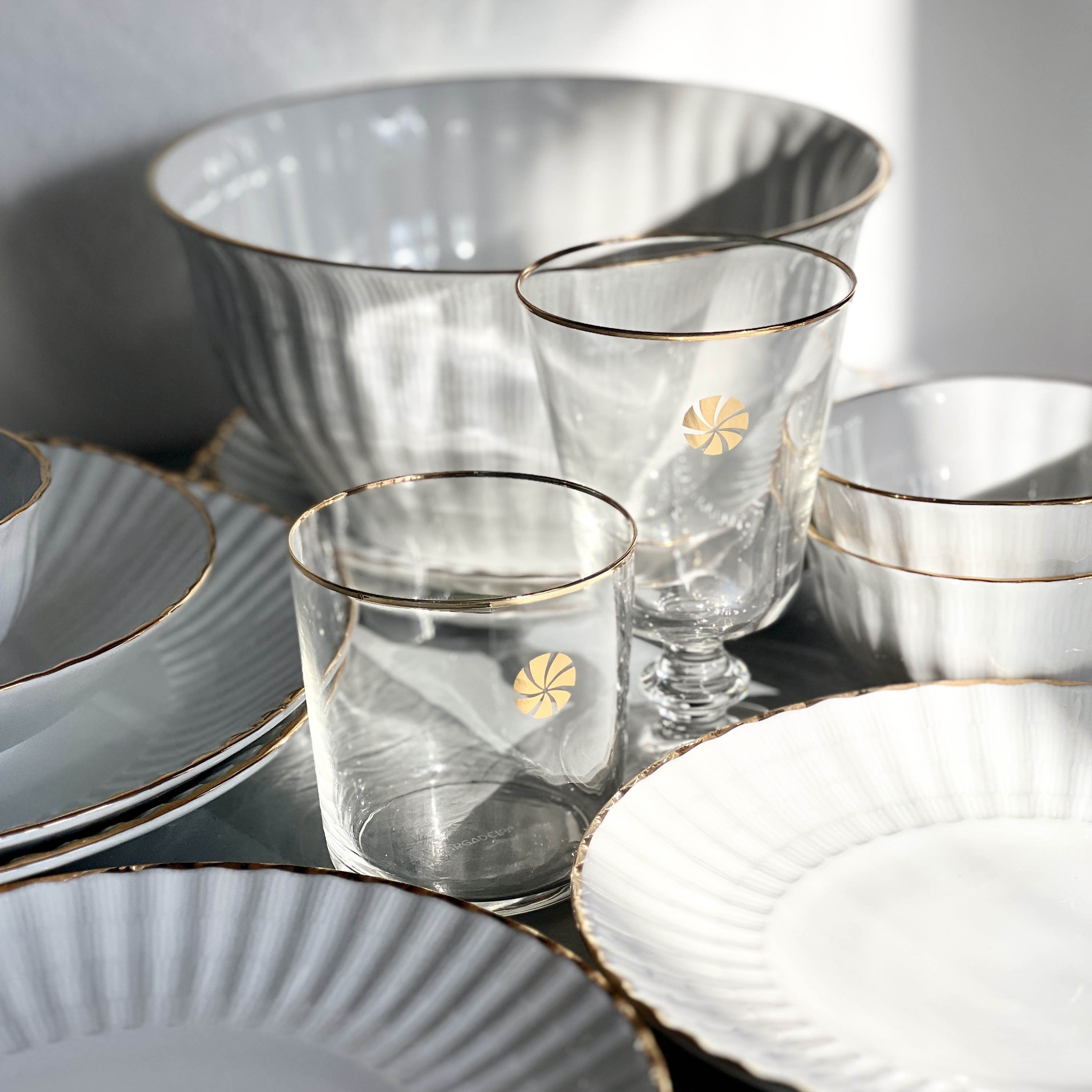 Pack de 6 vasos que presentan un aspecto elegante y minimalista con líneas sencillas y angulosas, destacando el filo oro.