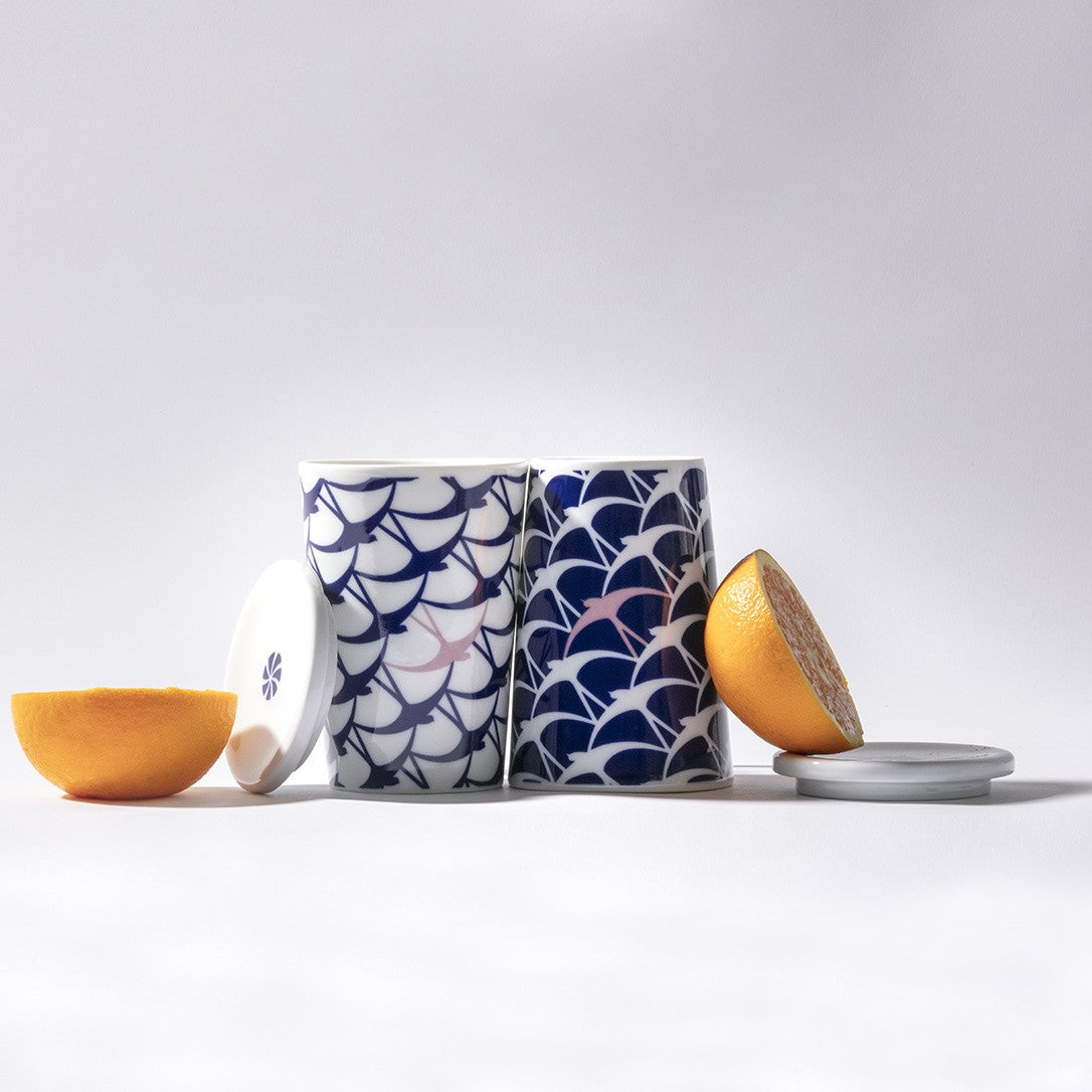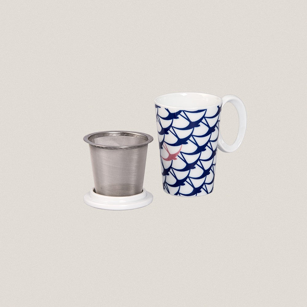 Sargamug con tapa y colador de acero inoxidable, decorada en dos colores e inspirada en el vuelo de las golondrinas. Compuesto por: 1 Sargacónica Andorina Azul con tapa. 1 Sargacónica Andorina Blanca con tapa. Estuche Premium bicolor con interior de poliuretano. Medidas: Alto: 11 cm (sin tapa). Capacidad aprox.: 30 cl. Material: Porcelana. Cuidados: Apto para lavavajillas y microondas.