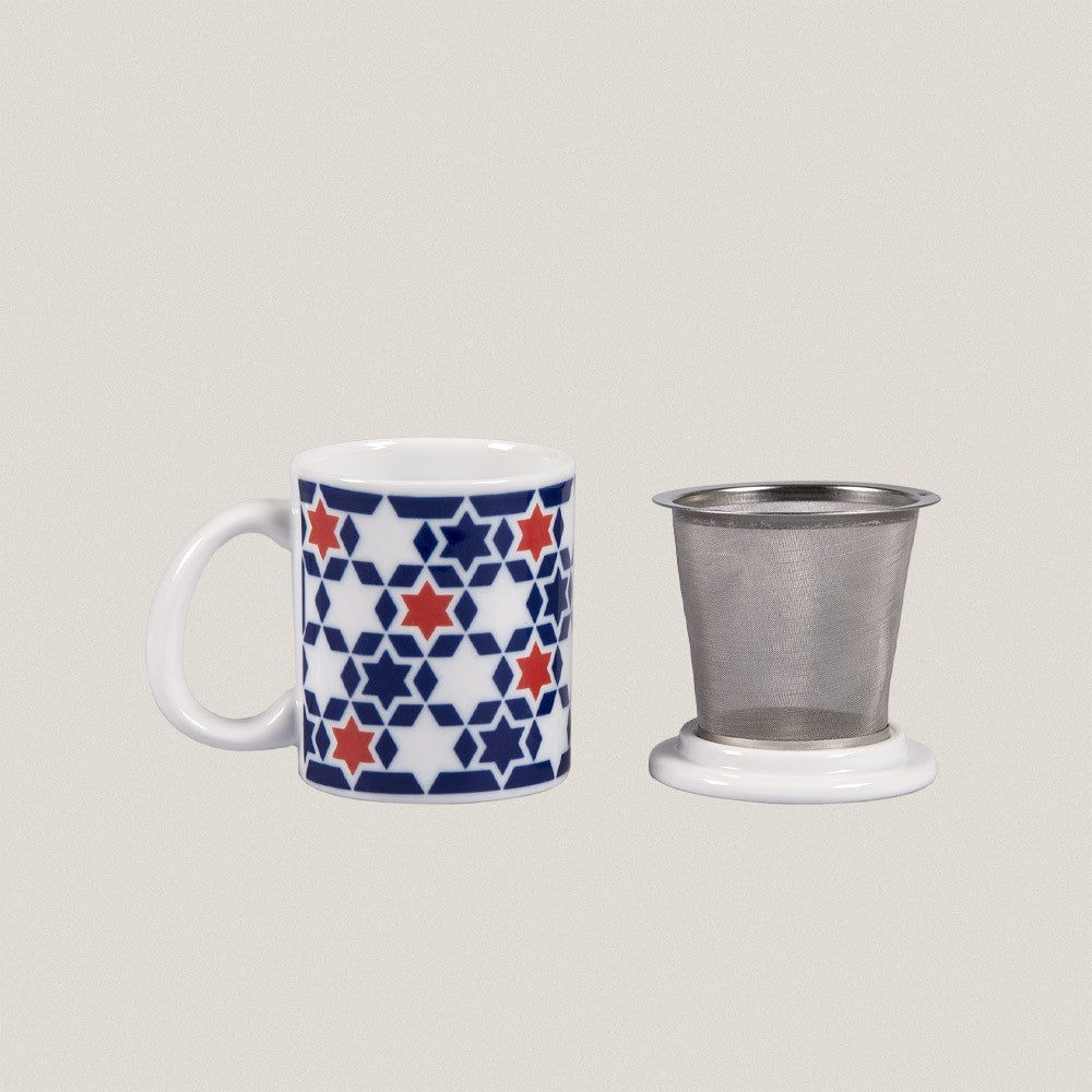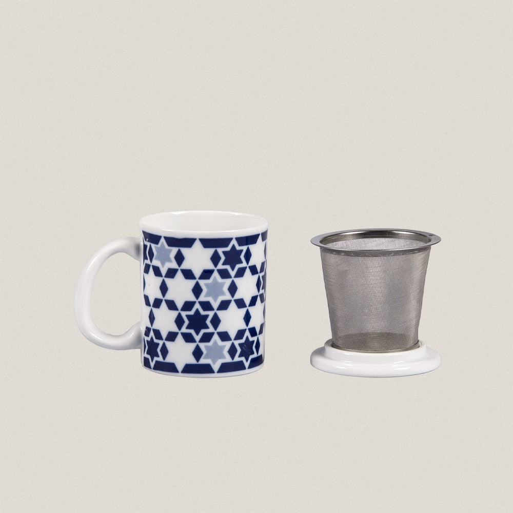 Sargamug con tapa y colador de acero inoxidable, decorado en dos colores e inspirado en las estrellas de la galaxia Vía Láctea.