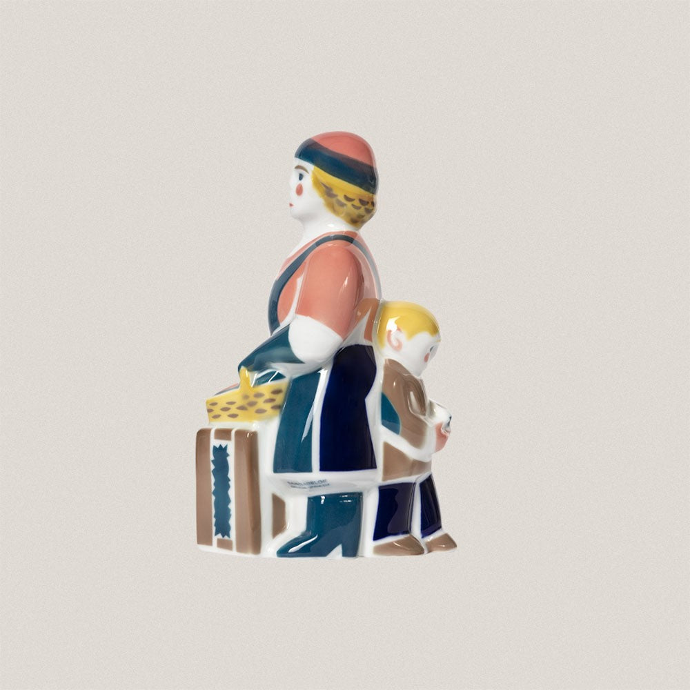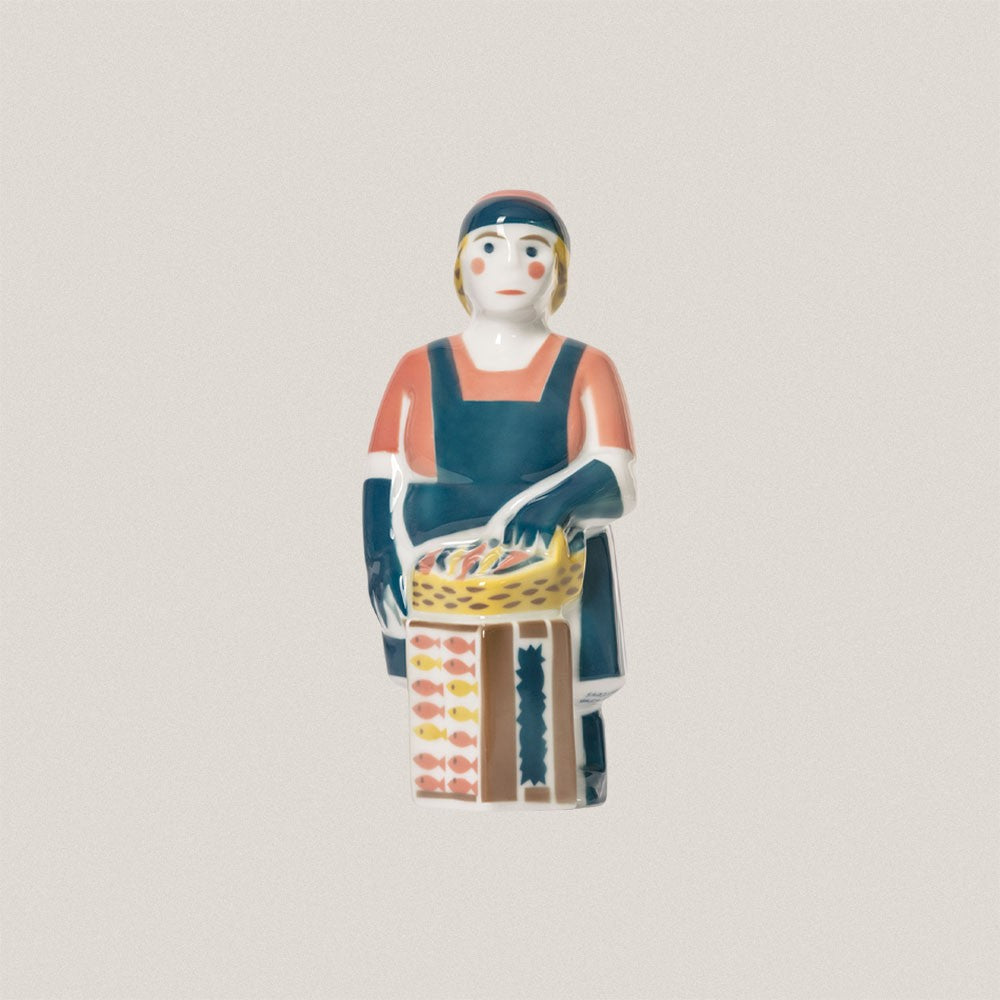 La pescadera es otra de las figuras más emblemáticas entre los oficios del mar que gran parte de la población gallega desempeña. En esta representación de una mujer pescadera el niño que la acompaña, tímido e irremediablemente obediente, hace referencia a la doble labor que la mujer desempeña en su día a día trabajando para ganar el pan y ocupándose de los cuidados de las personas que quieren. Creando un halo de respeto sobre ellas que esperamos se vea representado en esta pieza.