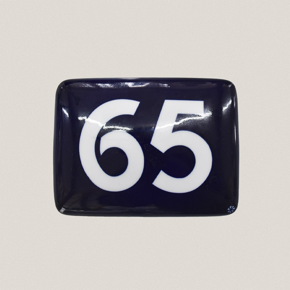 Placa de cerámica en color azul cobalto con números en blanco.