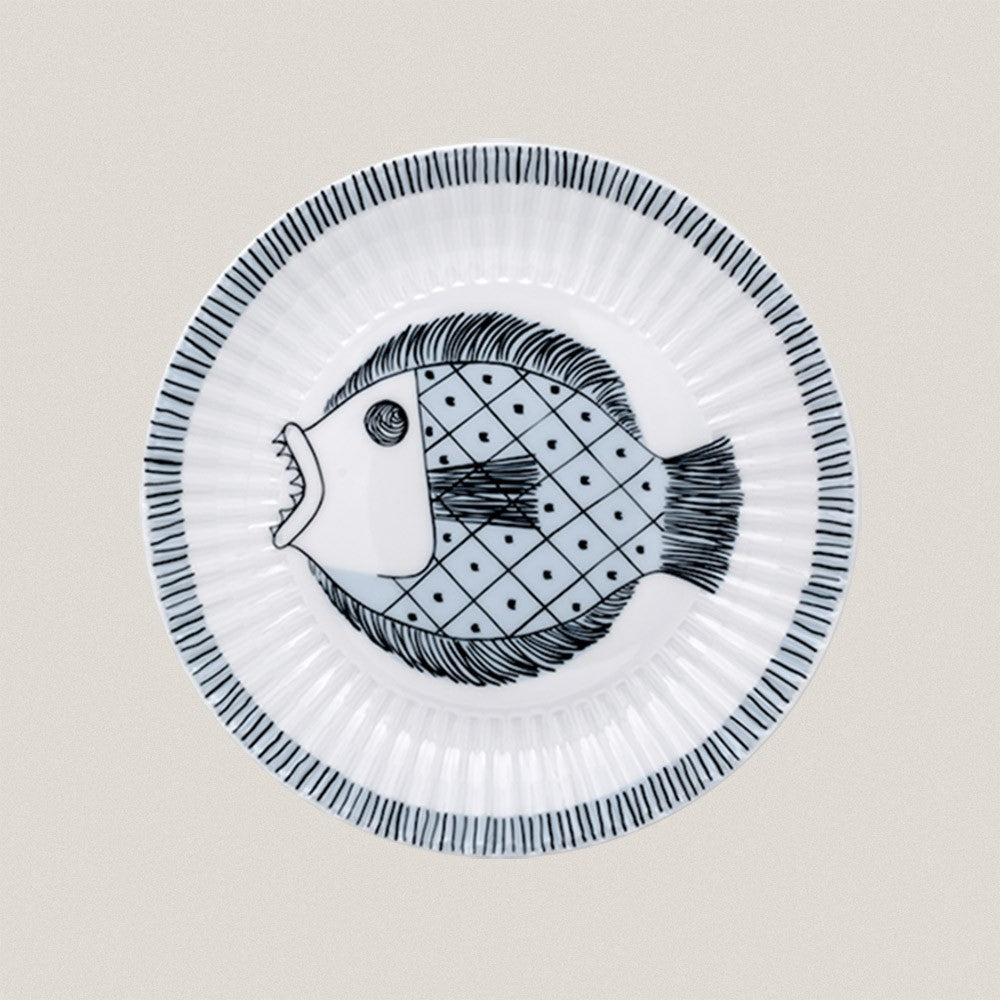 Plato llano grande perteneciente al decorado Salitre inspirado en el aspecto de la forma Cuncha, incorpora el motivo del pez.