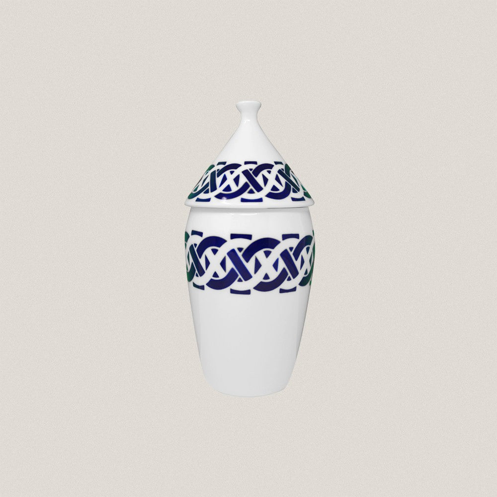 El decorado Encadrelado se inspira en los motivos de entrelazado, un elemento decorativo que podemos encontrar en manifestaciones artísticas de Galicia desde la cultura castrexa. Se trata de complejos patrones trenzados, frecuentes tanto en tallas en piedra como en las técnicas del bronce, la metalurgia del hierro o la joyería en oro. Medidas:
