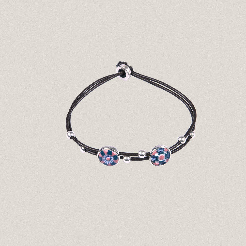 Descripción: Pulsera de cuero con dos placas cerámicas pintadas a mano. Disponible en dos tamaños M/L.