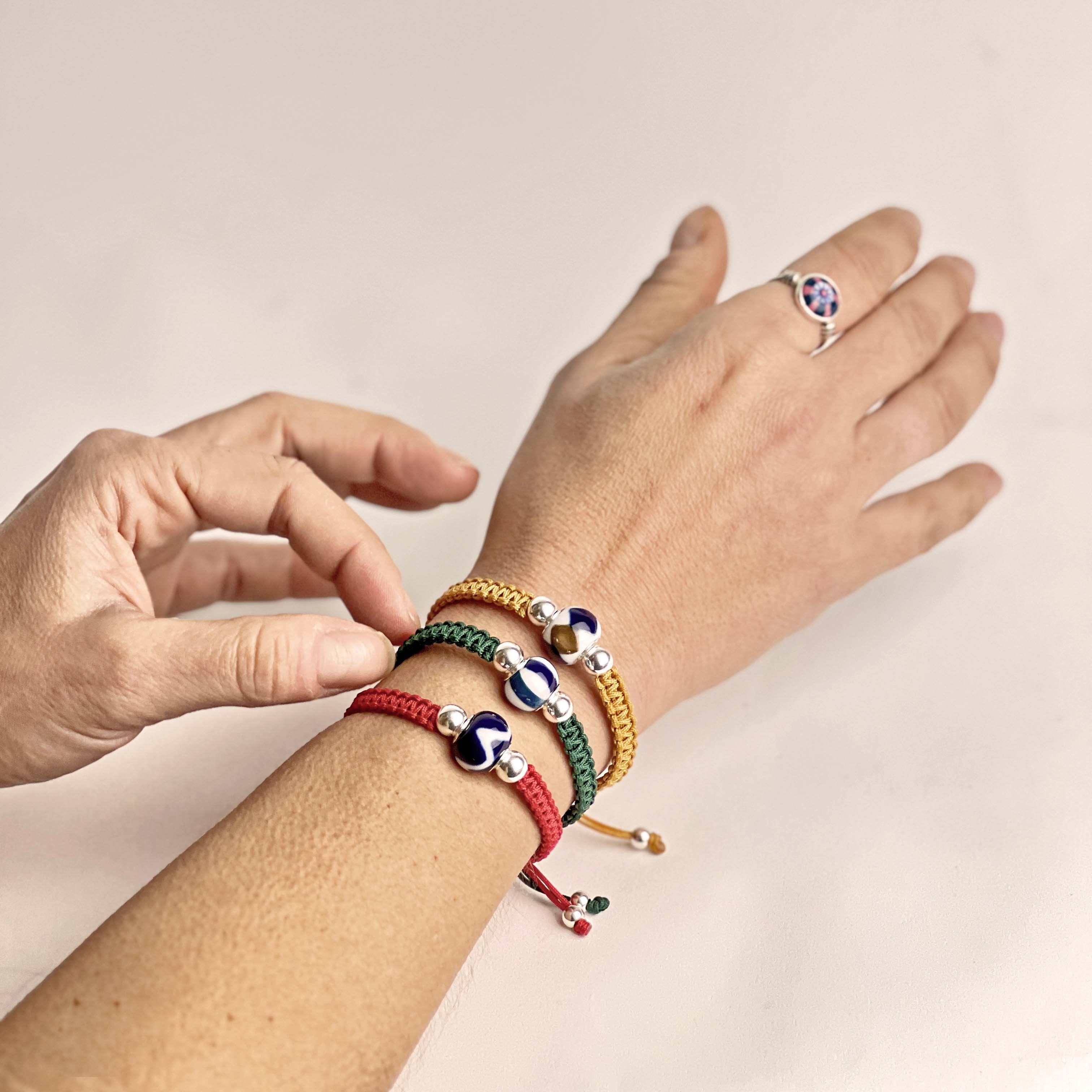 Pulsera ajustable de macramé rematada en plata con pieza central de porcelana. Material:Porcelana, Plata de Ley, Hilo de poliéster. Cuidados: Plata: Limpiar en agua tibia con detergente lavavajillas y cepillo suave de uñas.