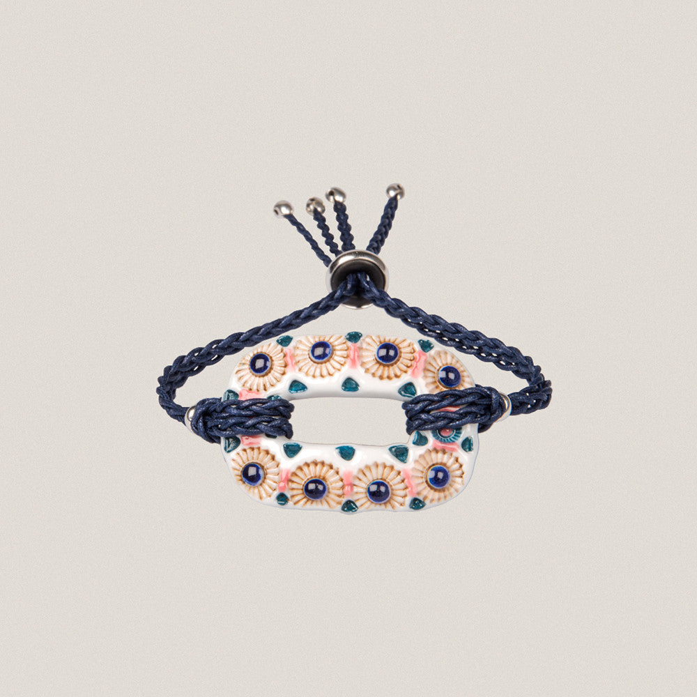 Pulsera con placa de cerámica con motivos florales, abalorios de plata 925 y cordón 100% algodón.