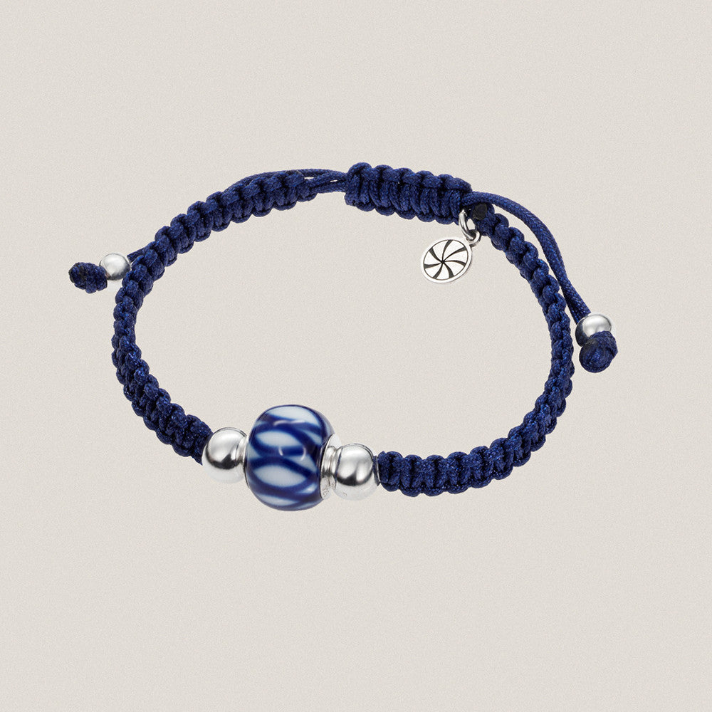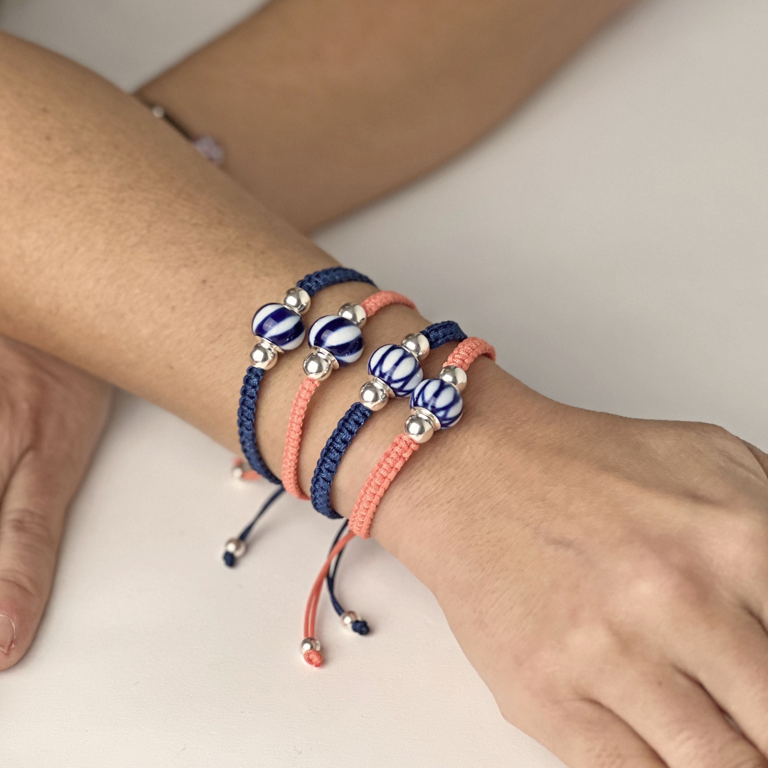 Pulsera ajustable de macramé rematada en plata con pieza central de porcelana.