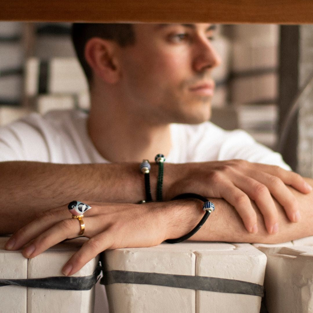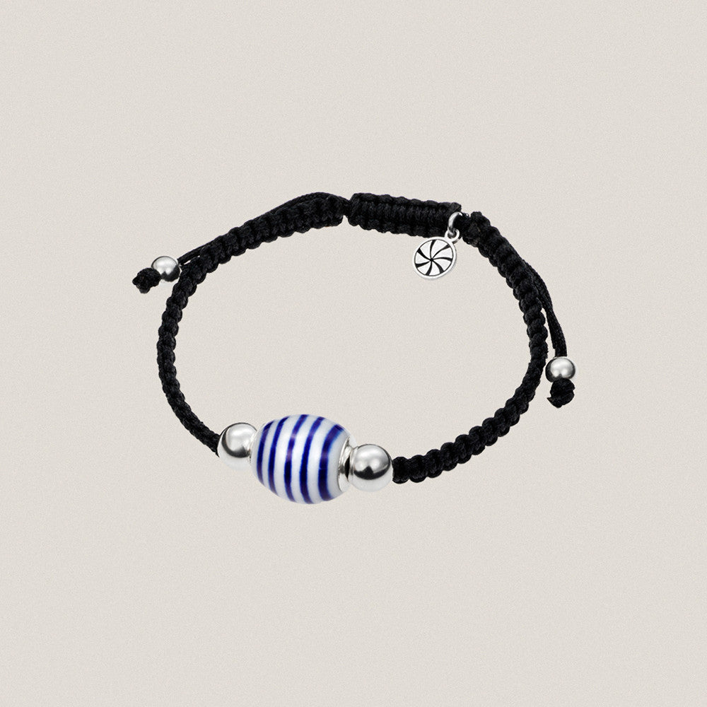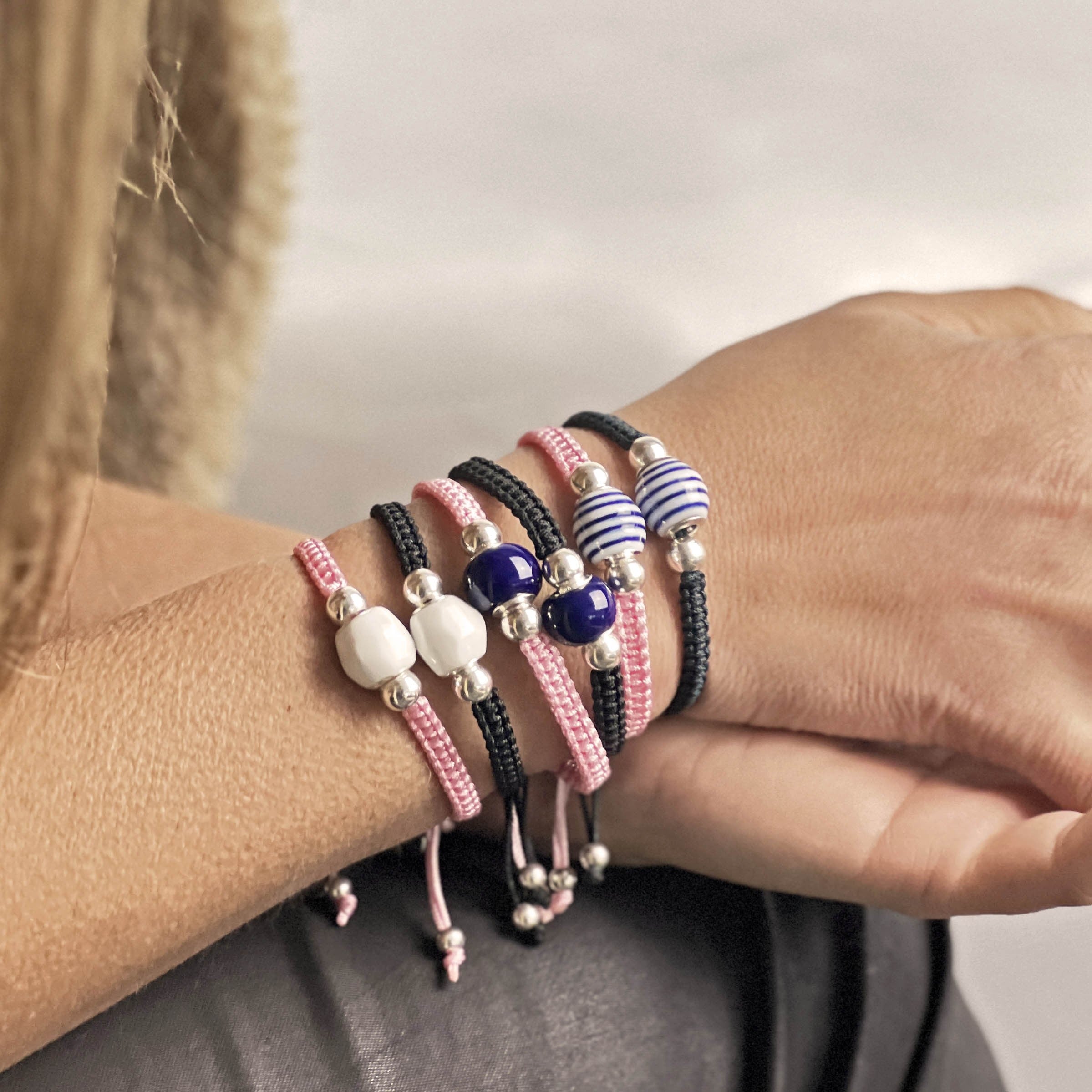 Pulsera ajustable de macramé rematada en plata con pieza central de porcelana.