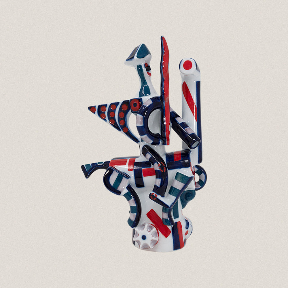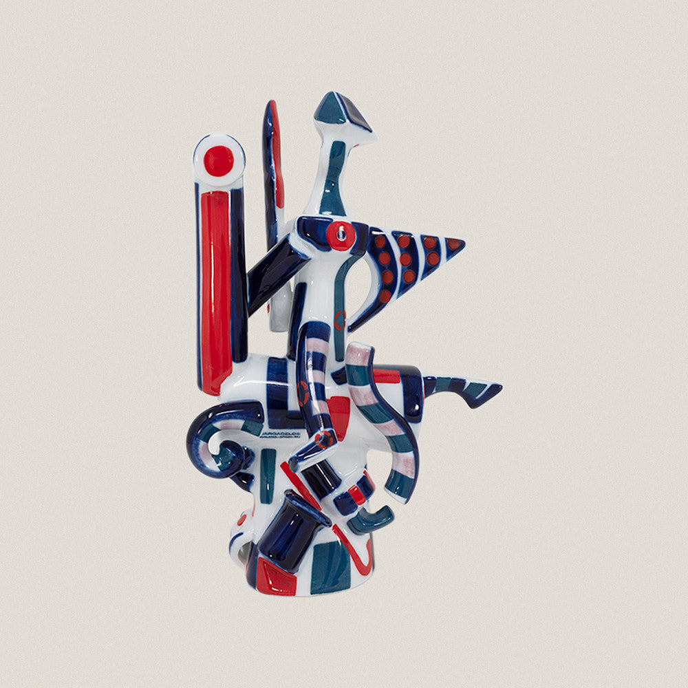 Imagen abstracta del Apóstol Santiago a caballo. Esta pieza decorativa fue pintada a mano sobre porcelana vidriada con un color rojo intenso, cociéndose en esta etapa a 800º C (por tercera vez), por lo que su proceso de producción es más laborioso. Dimensiones: Altura: 22 cm. Material: Porcelana. Cuidados: Limpiar con un paño suave y húmedo.