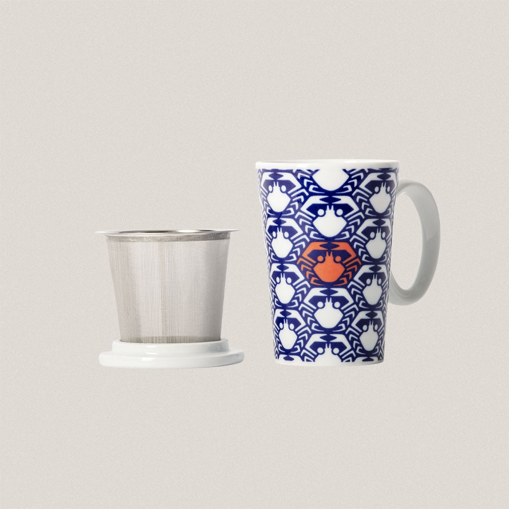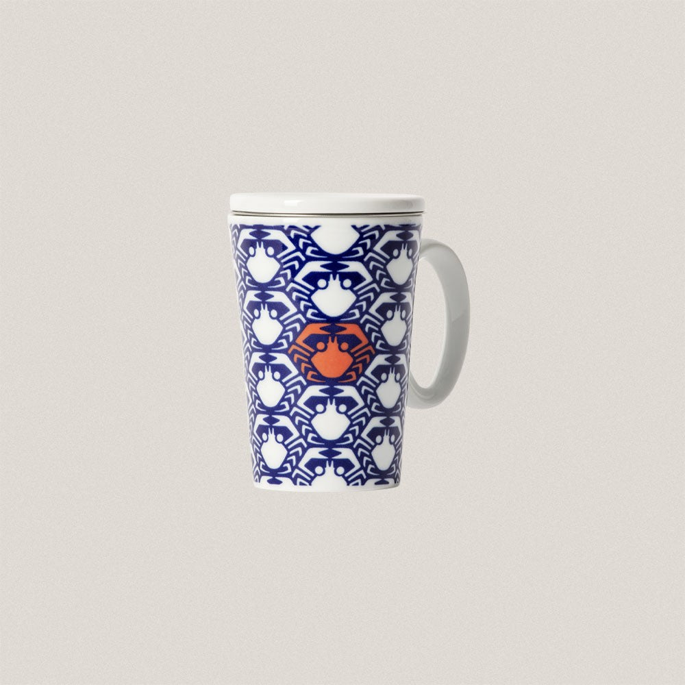 Sargamugs con tapa y colador de acero inoxidable, decorada en dos colores e inspirada en el centollo o centolla viajero de las costas Gallegas.