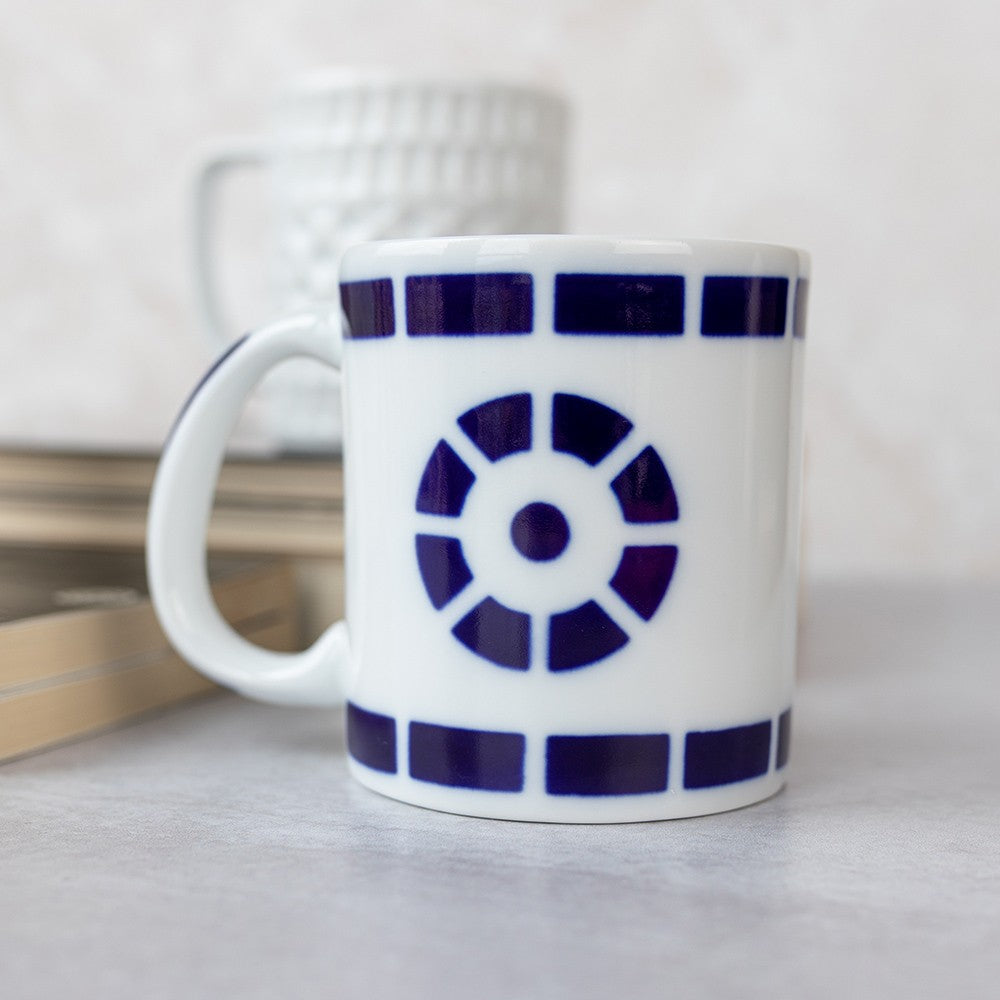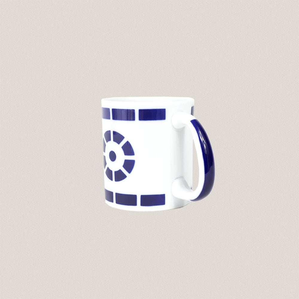 Coroa es un decorado con resonancias astrales y referencias en los viejos petroglifos, inscripciones rupestres tan frecuentes y características en la ancestral cultura galaica. Medidas: Alto: 9 cm. Capacidad: 30 cl. Material: Porcelana. Cuidados: Apto para lavavajillas y microondas.