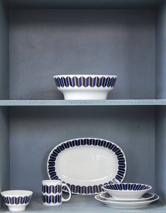 A principios de la década de los setenta, en SARGADELOS de desarrolló un lenguaje propio de motivos decorativos de marcado componente geométrico que bebe de la tradición del arte y la arquitectura gallega. Entre estas primeras ornamentaciones aparece el estudio del decorado Diédrico. Recuperamos este decorado aplicado a la forma Estrela. Se compone de dos colores que contrastan y se complementan, negro y azul cobalto, lo que provoca un efecto óptico resaltando los volúmenes.