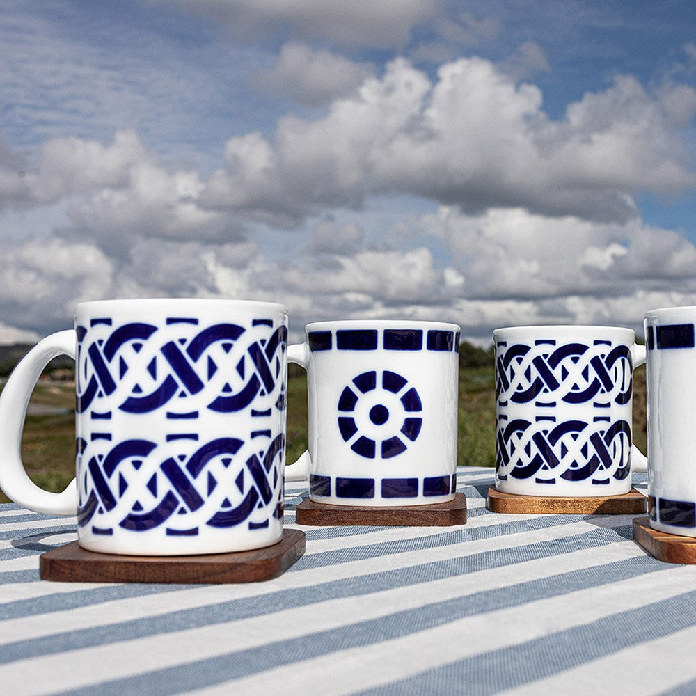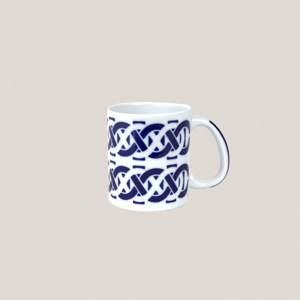 El decorado Encadrelado se inspira en las decoraciones de entrelazado, un elemento decorativo que podemos encontrar en manifestaciones artísticas de Galicia desde la cultura castrexa. Se trata de complejos patrones trenzados, frecuentes tanto en tallas en piedra como en las técnicas del bronce, la metalurgia del hierro o la joyería en oro. Medidas: Alto: 9 cm. Capacidad: 30 cl. Material: Porcelana. Cuidados: Apto para lavavajillas y microondas.