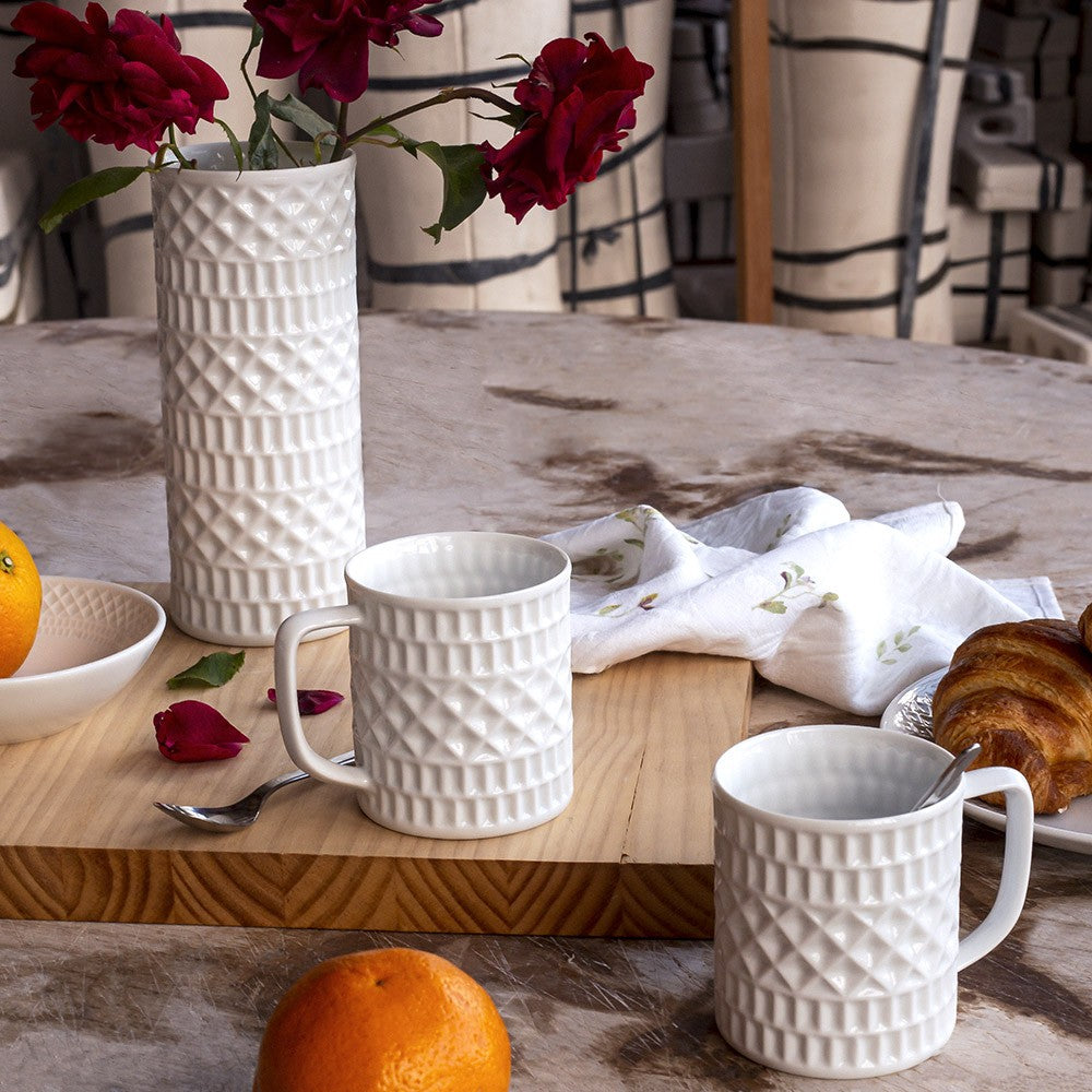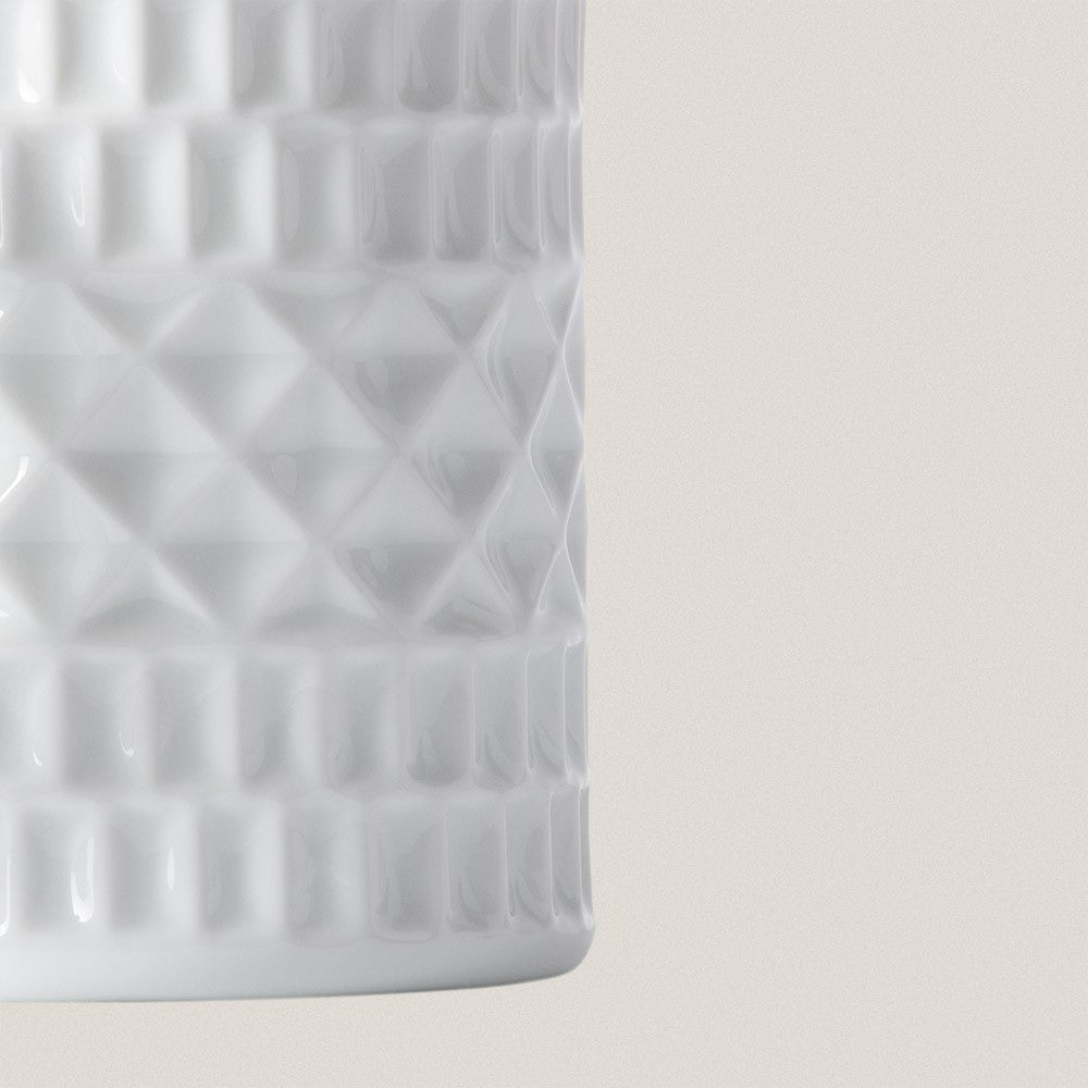 El relieve Portomarínico se inspira en las ménsulas del templo de San Juan de Portomarín, ubicado justo donde el Camino Francés a Santiago de Compostela atraviesa el río Miño. Medidas: Alto: 9 cm Capacidad: 30 cl Material: Porcelana Cuidados: Apto para lavavajillas y microondas.