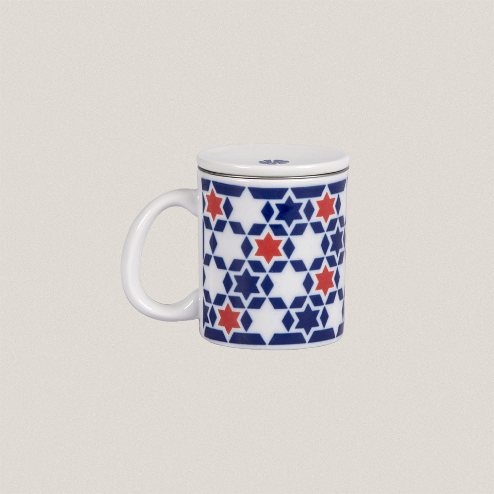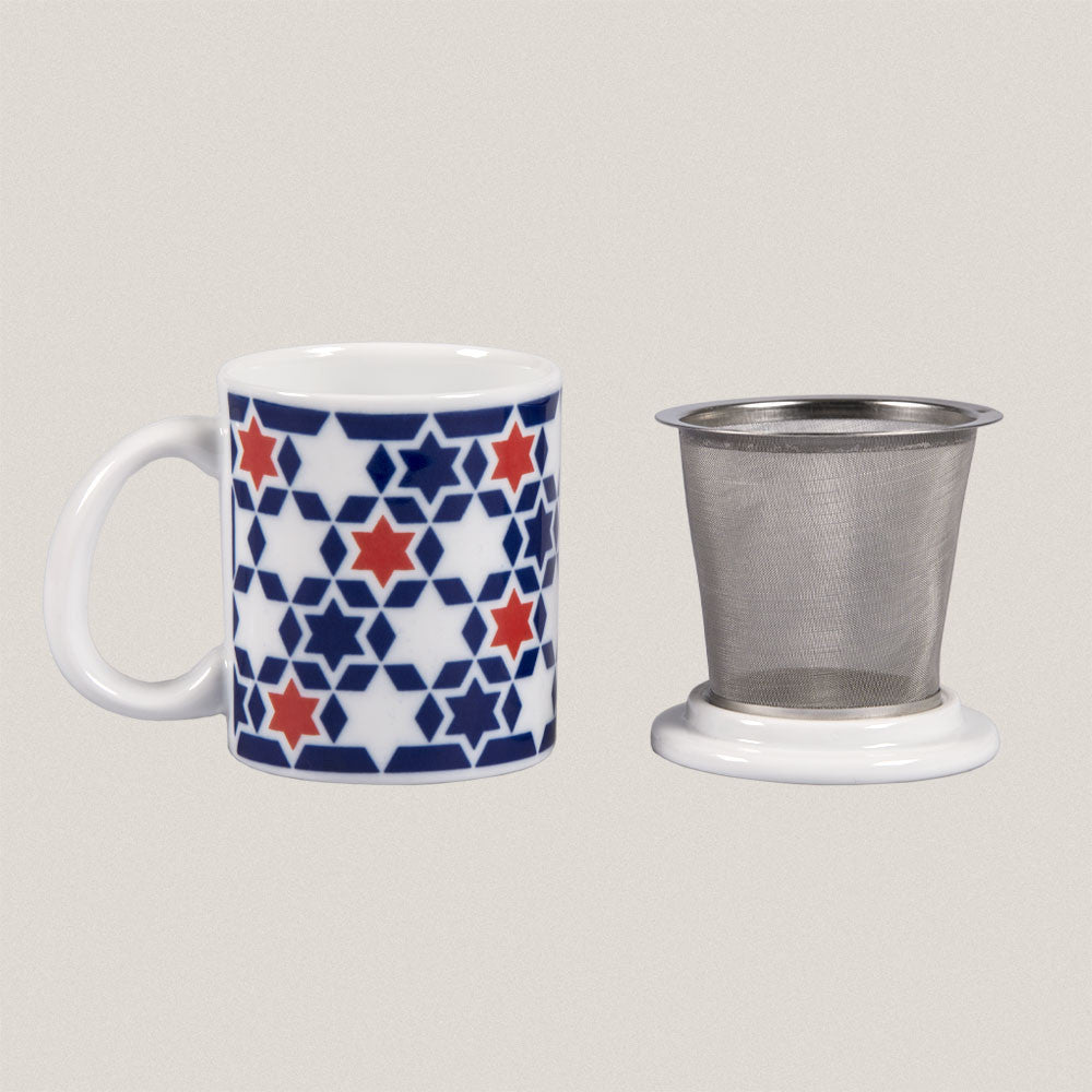 Sargamug con tapa y colador de acero inoxidable, decorado en dos colores e inspirado en las estrellas de la galaxia Vía Láctea.