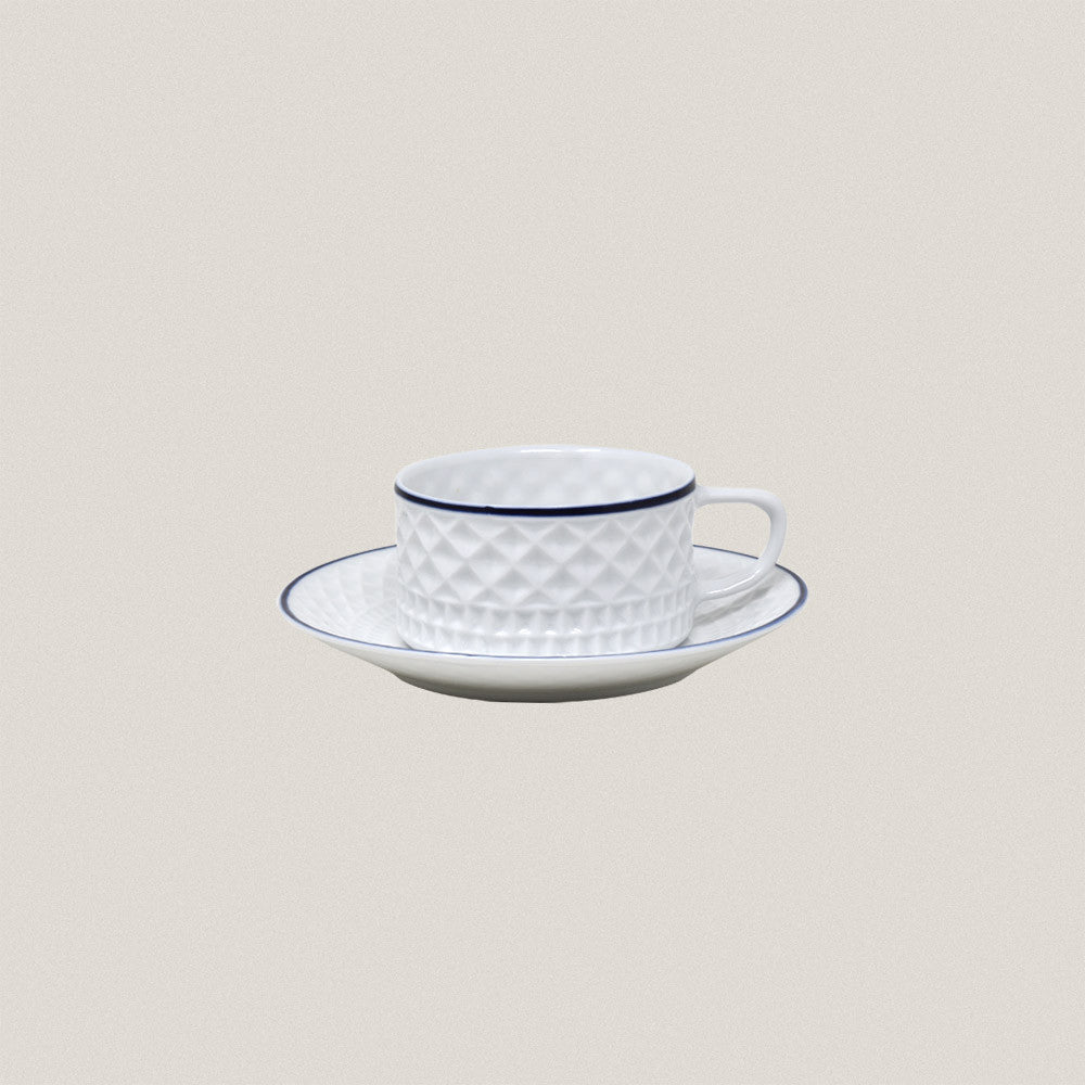 Sus exquisitos motivos en forma de rombos y rectángulos, inspirados en el arte románico gallego, convirtieron a la vajilla Portomarínico de Sargadelos, en una de las más bellas y demandadas de la firma. Une la tradición del arte medieval y la estética contemporánea de motivos geométricos. Portomarínico es una de las icónicas vajillas completamente blancas de Sargadelos. A partir de ahora, también exhibirá un filo azul cobalto, el color emblemático de la firma, en un nuevo modelo innovador y lleno de frescura que presentan como novedad para acompañar a la ya clásica Portomarínico blanca.