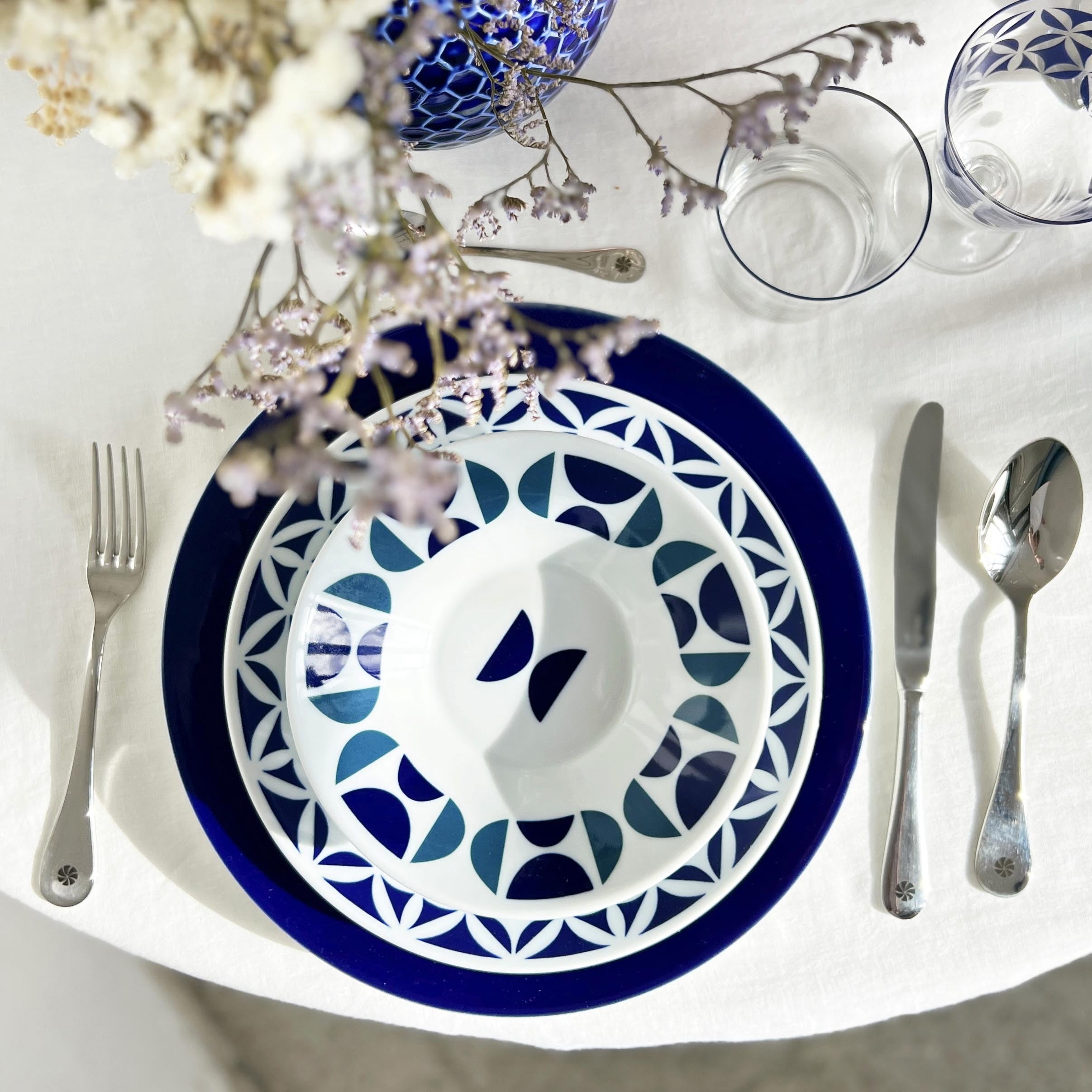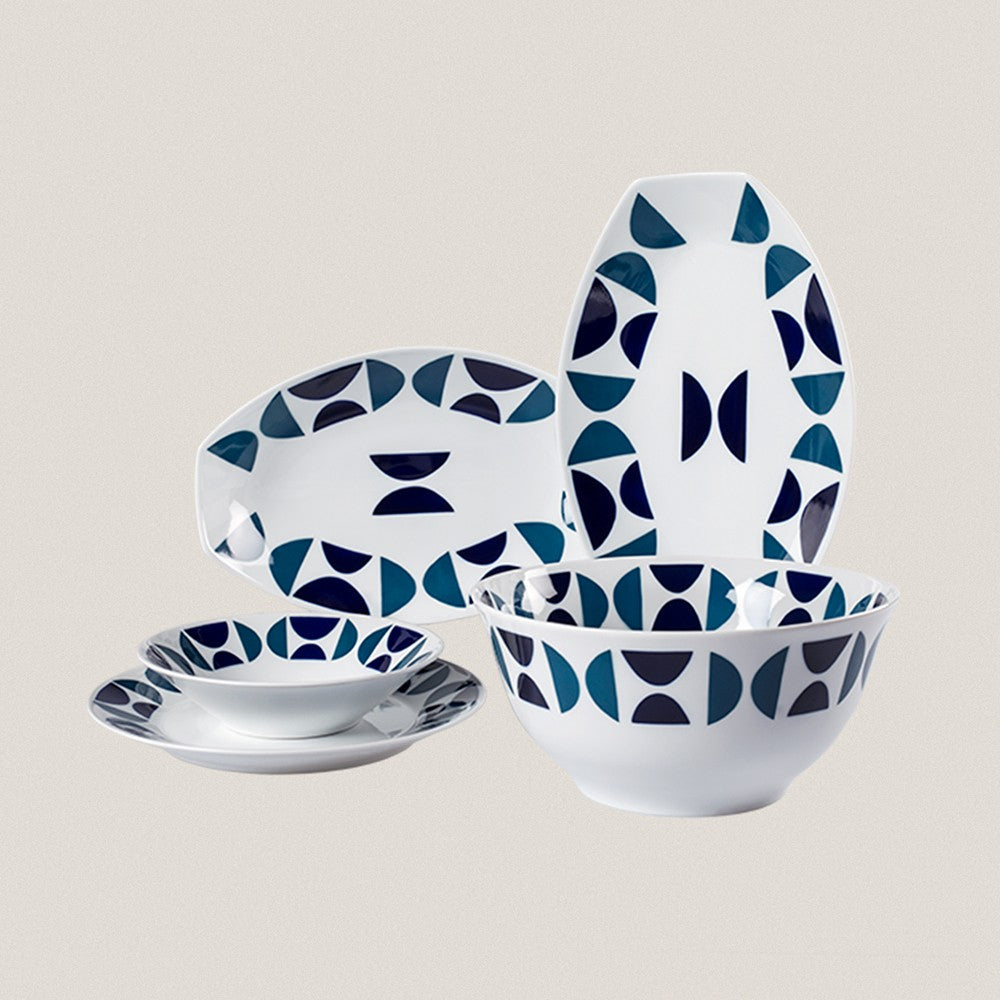 El decorado AB1 se inspira en las figuraciones geométricas del románico y barroco gallego. El resultado final es una combinación de formas que, despegadas de lo figurativo, evocan sentimientos y apariencias. Composición: 12 Platos llanos. 6 Platos hondos. 6 Platos postre. 2 Fuentes pequenas. 1 Ensaladera. Material: Porcelana. Cuidados: Apto para lavavajillas y microondas.