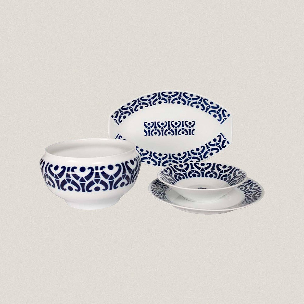 El decorado Contra se basa en formas esquemáticas contrapuestas, que otorgan a nuestros productos un carácter especial. Composición: 12 Platos llanos. 6 Platos hondos. 6 Platos postre. 2 Fuentes pequeñas. 1 Ensaladera. Material: Porcelana. Cuidados: Apto para lavavajillas y microondas.